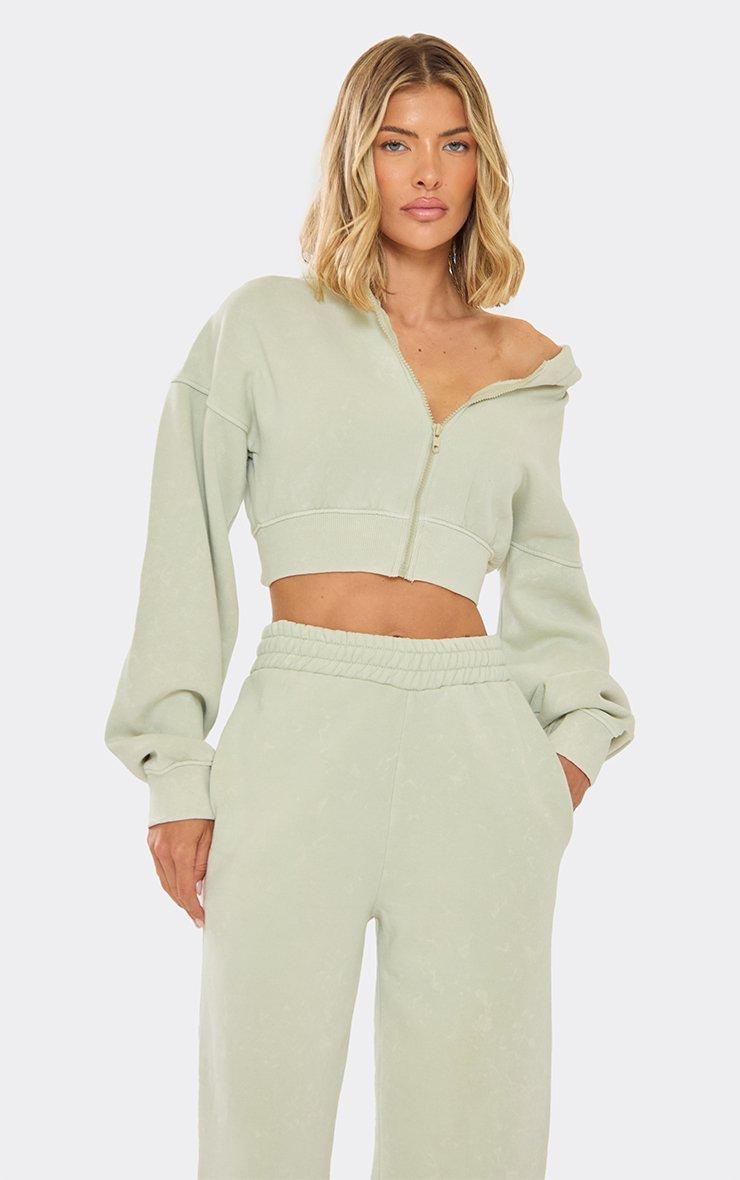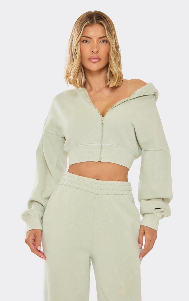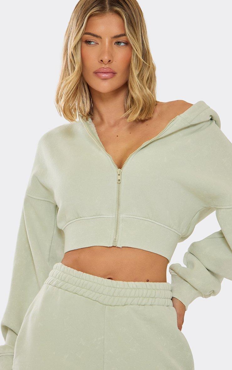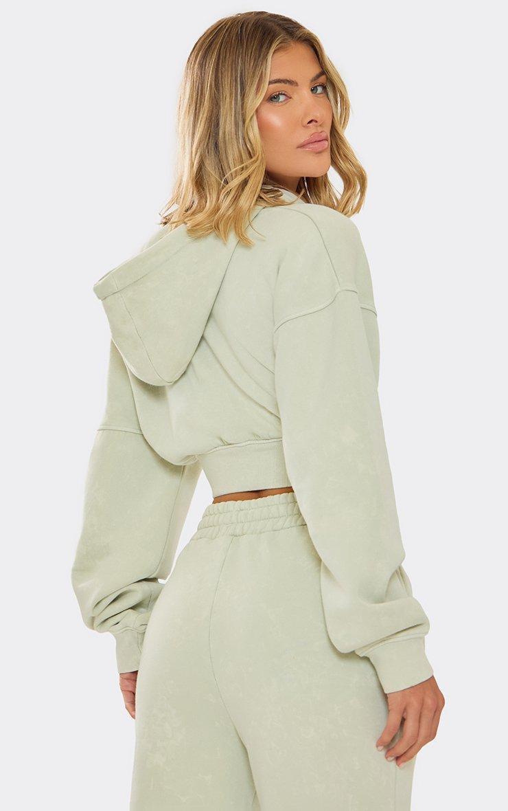 Long Sleeve Oversized Zip Detail Cropped Hoodie In Washed Sage Green