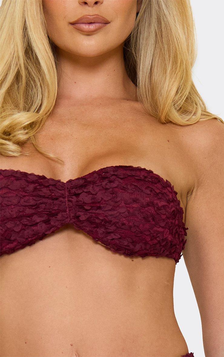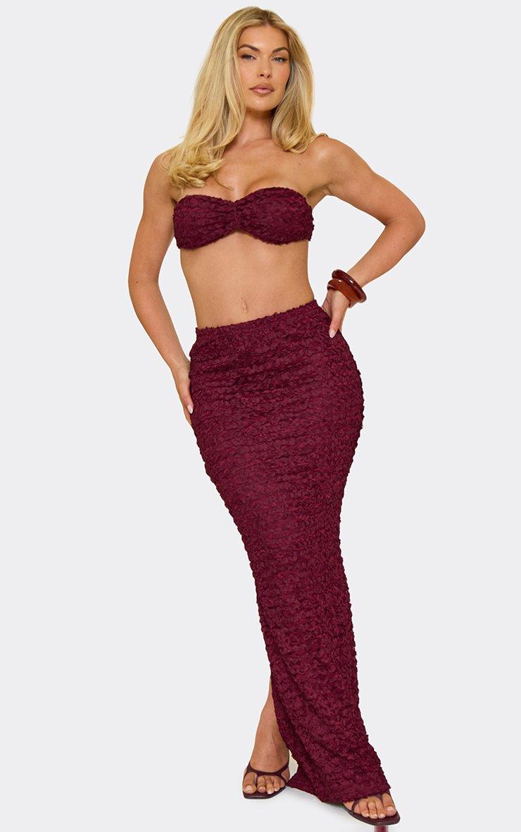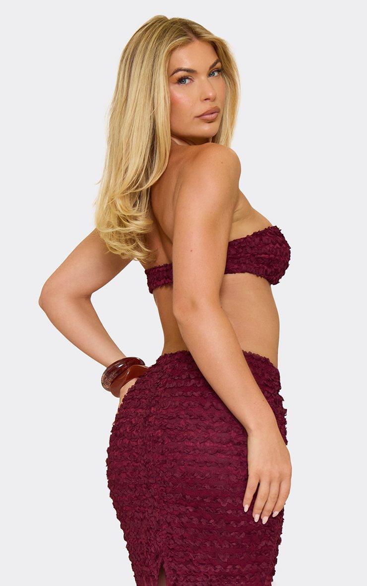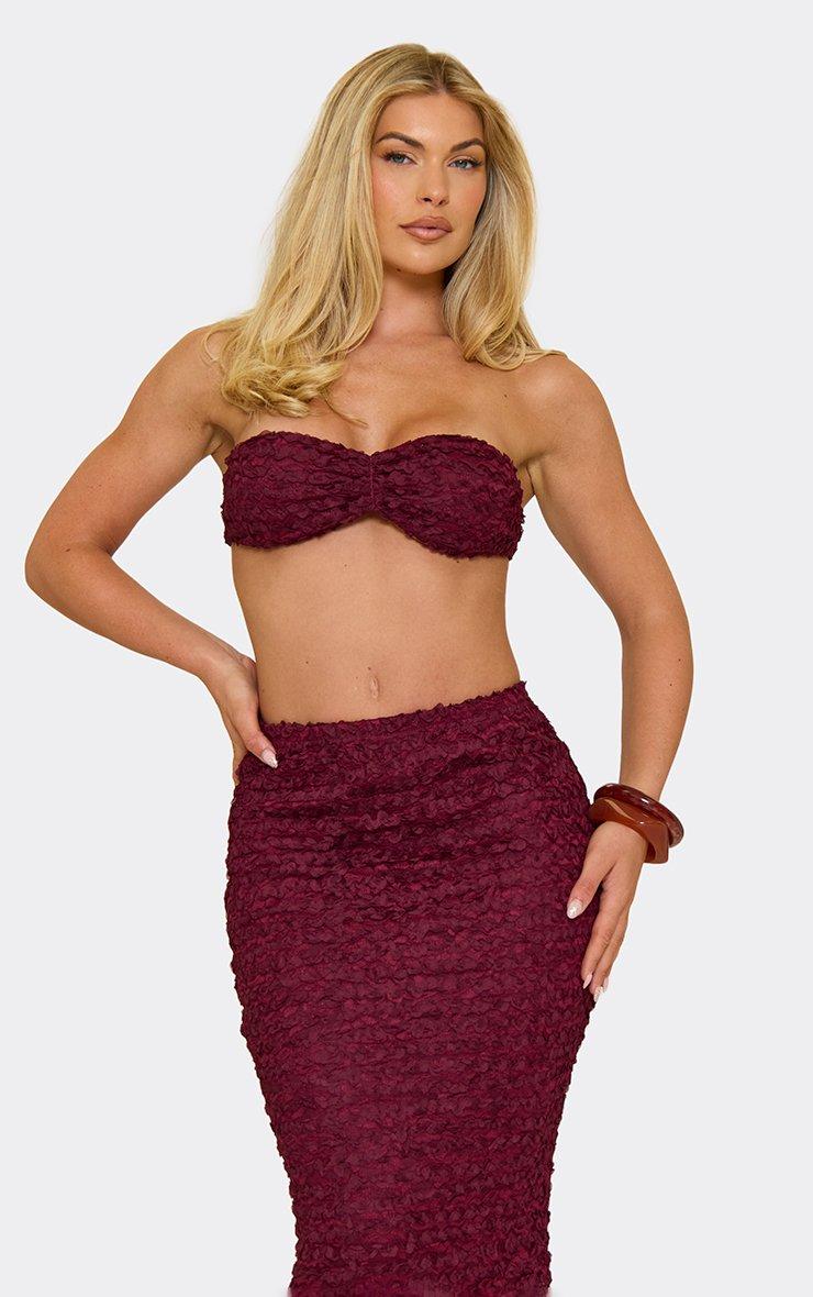 Serve bold vibes, doll! Featuring burgundy textured fabric in a bandeau bralet style, this top brings chic, standout energy perfect for party nights and statement days.