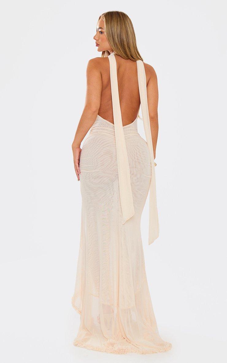 Choker Neck Plunge Cut Out Split Leg Ruched Detail Maxi Dress In Cream Mesh