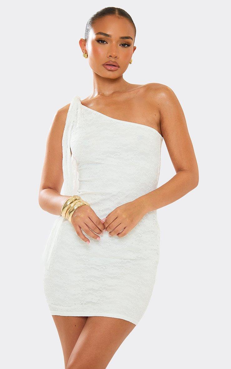Make it all about you in this white lace one-shoulder mini dress. Fresh and fierce, this lace dress blends elegance with an EGO edge. Crafted in white lace, it boasts a sleek one-shoulder neckline for a clean, captivating cut. Plus, the drape detail gives this dress an extra dash of drama. For a white hen night outfit or fresh going-out glam, style this white dress with strappy gold heels and matching chunky bracelets . Dripping in luxury, this white lace one-shoulder mini dress levels up your look. Key Features White Lace One Shoulder Drape Detail Mini Length Figure-Hugging