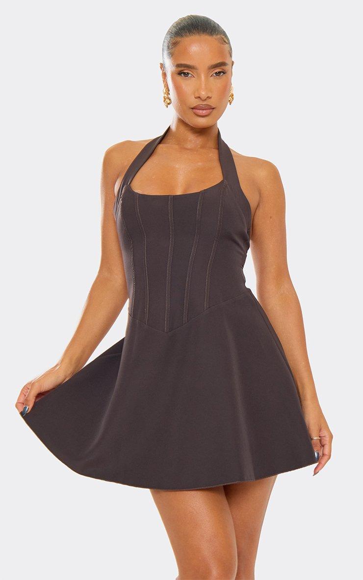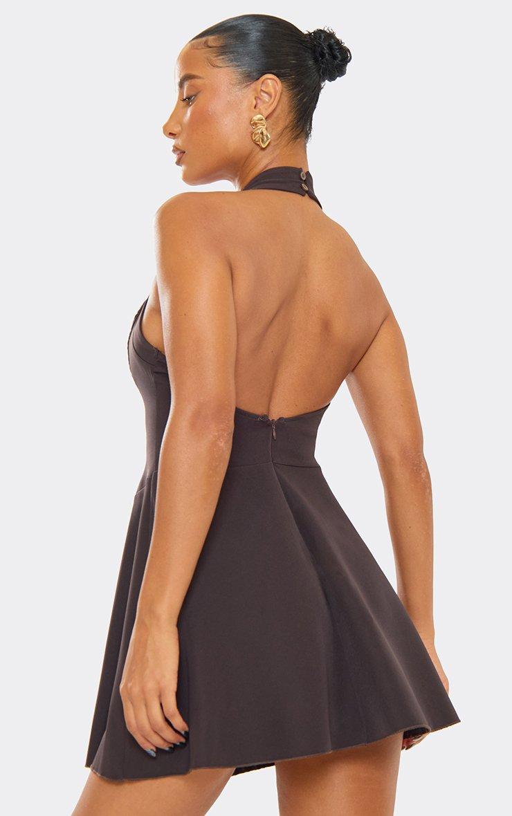 Are your going-out dress ideas missing something girly? Throw this chocolate brown skater dress into the rotation. Bringing all the feminine energy you're after, this chocolate brown mini dress features a cinched waist design and a playful, flared skirt that flows with you. Perfectly tight and loose in all the right places, this halter-neck dress is made with a figure-flattering fabric that works wonders for your silhouette. If you style this chocolate brown skater dress with gold bracelets , your favourite hoop earrings , and clear Perspex heels , it'll be one of those guaranteed-to-impress dresses for a dinner date. It's one of those ‘Who's she?' dresses . Key Features Brown Colour Cinched Waist Detailing Skater Skirt Mini Length Open-Back Design Sleeveless
