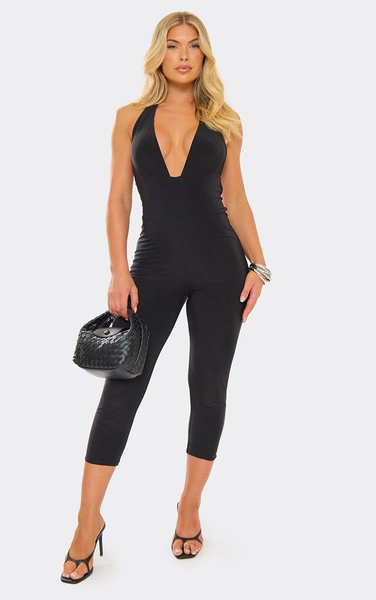 Halterneck Plunge Capri Style Jumpsuit In Black