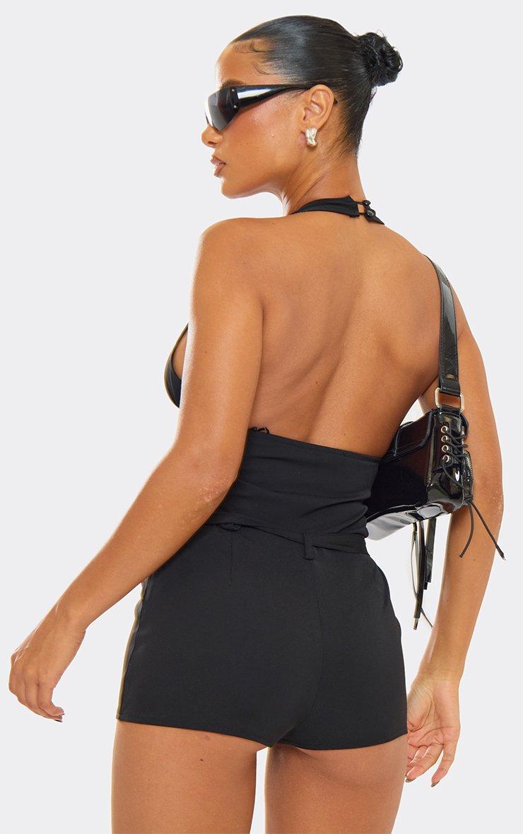 Weekend glam, doll. Featuring a black material with belted detailing and a halterneck design, this playsuit is giving bold, chic vibes for your night-out moments.