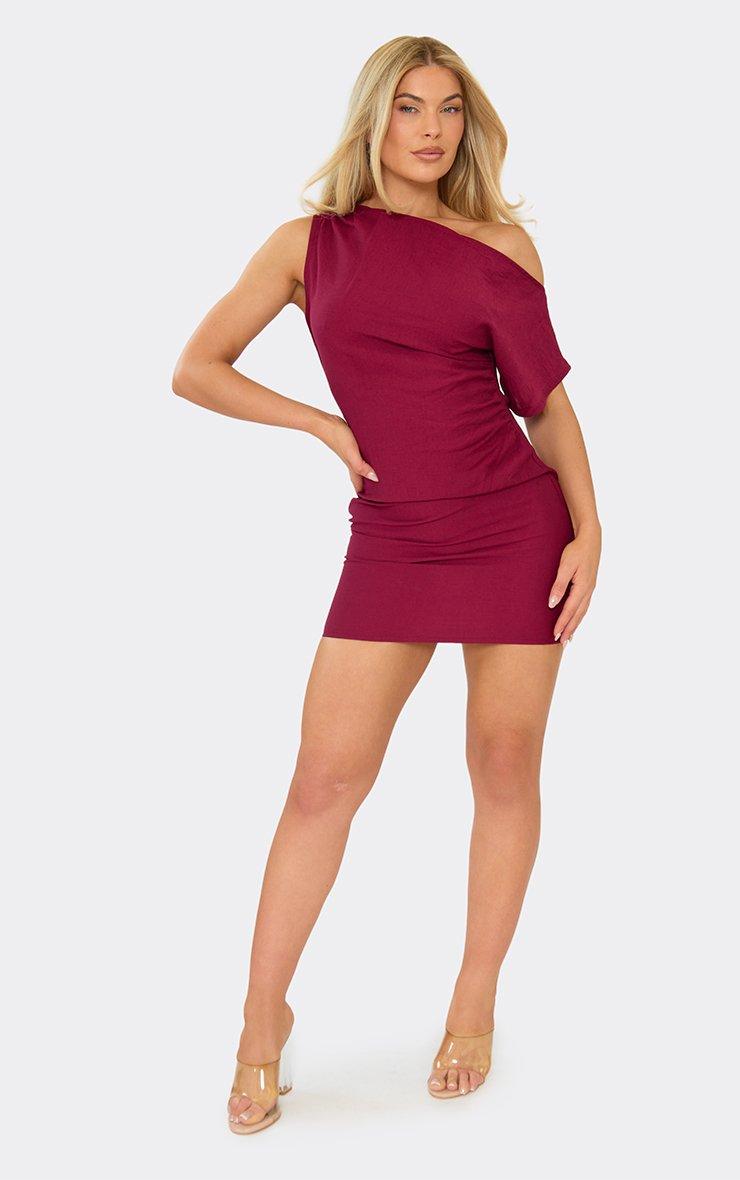Asymmetric One Shoulder Ruched Detail Mini Dress In Burgundy Woven