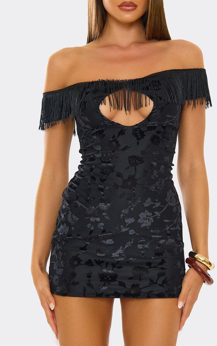 Ready to slay, doll! Featuring black devore fabric with bardot fit, keyhole cut out, and tassel trim detailing, this mini dress brings bold, chic vibes with a dramatic edge.