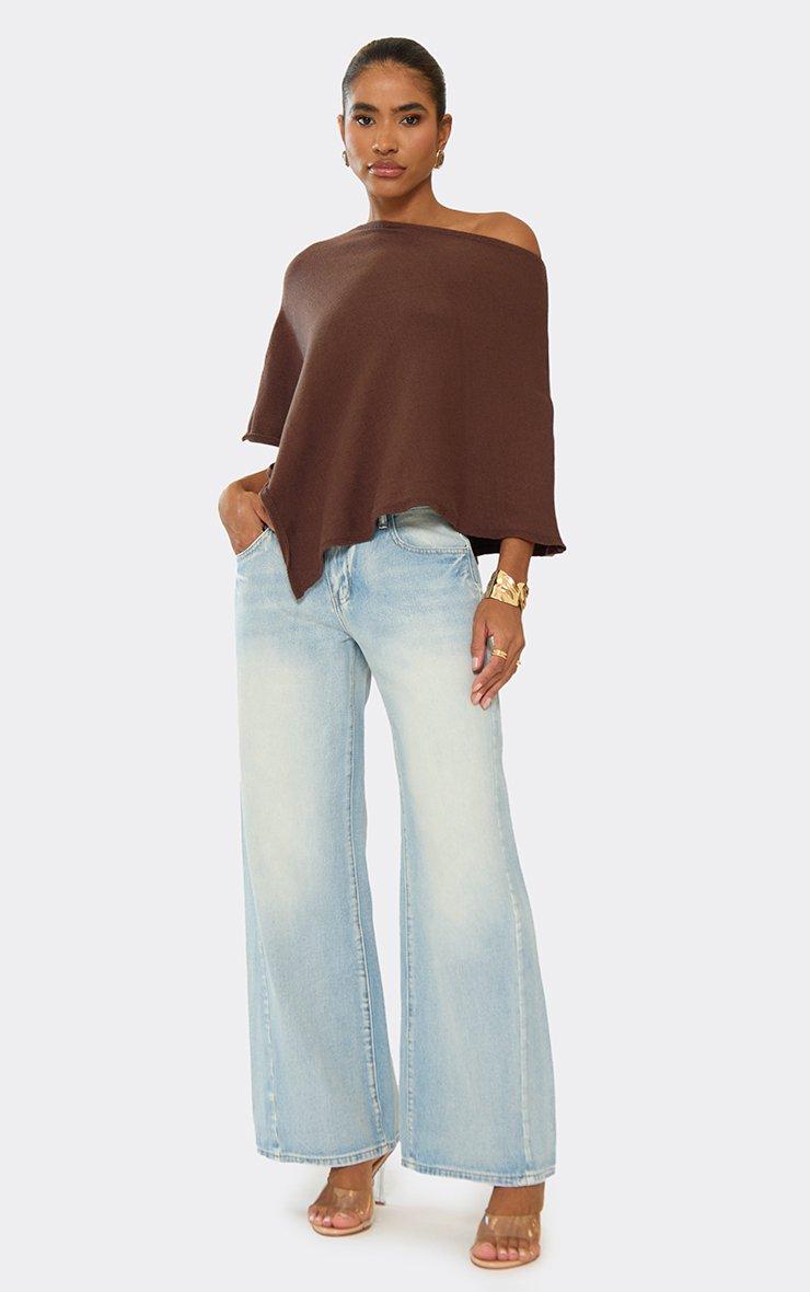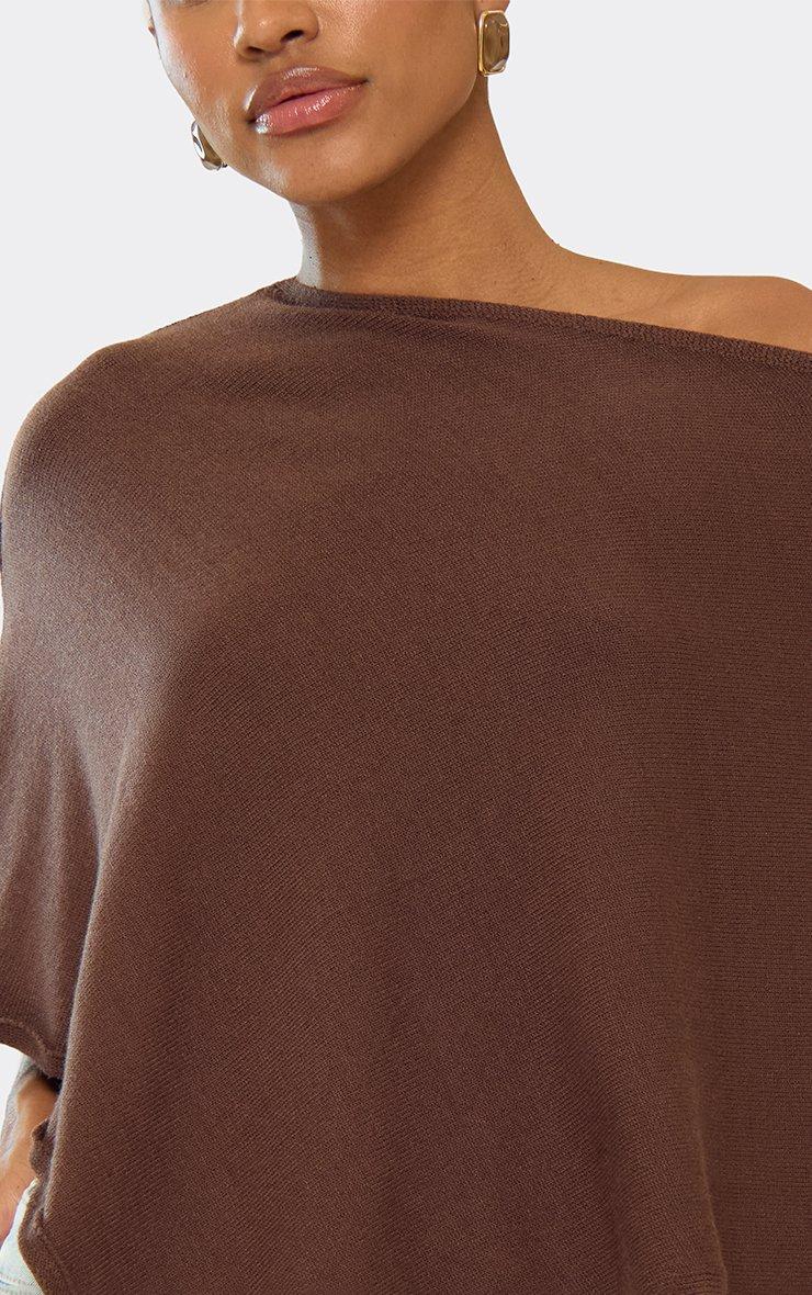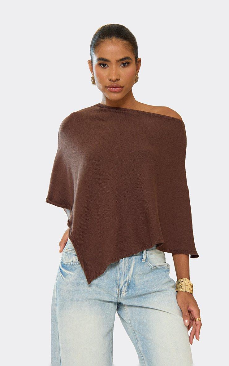 Create endless, effortlessly classy outfits with this brown cape top. Not your average knitwear, this top stuns with its floaty cape design and goes-with-everything brown hue. Made with a loose, flowy fit, this knitted top is so breathable and comfy to wear. Want some help on how to style a jumper? We've got some inspo for you. This brown cape top looks so chic with low-rise jeans and gold hoops . It's an easy wardrobe win. Key Features Chocolate Brown Knit Cape Design ¾ Sleeves Loose Fit Asymmetric Neck