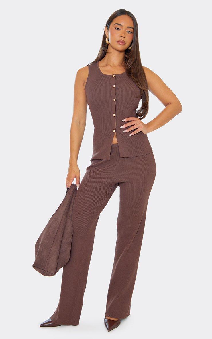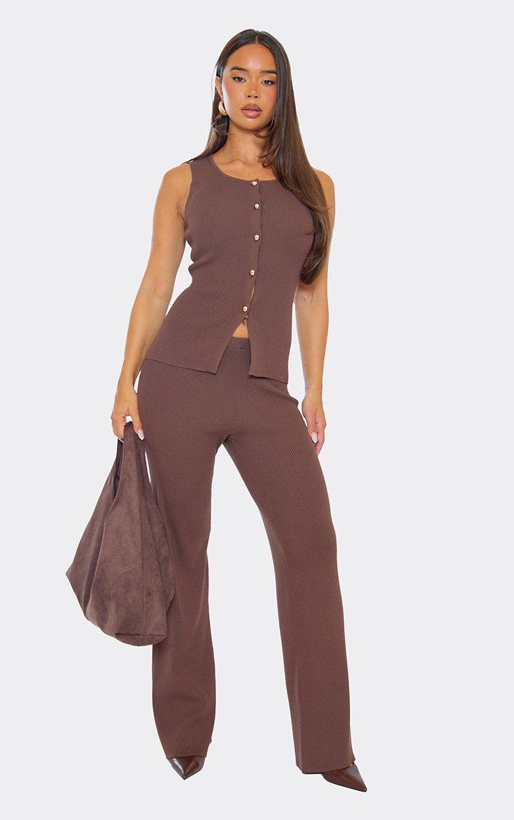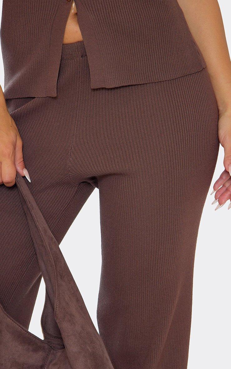 Mid Rise Wide Leg Detail Trousers In Chocolate Brown Knit