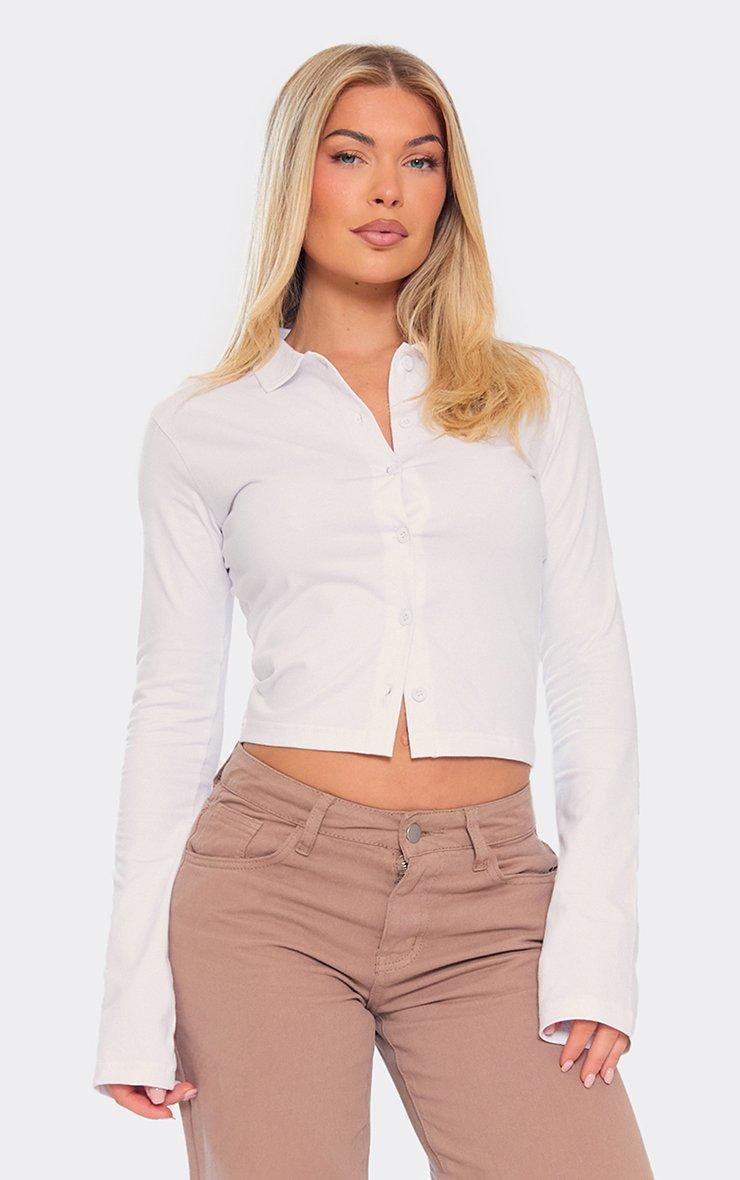 Long Sleeve Collar Button Down Fitted Top In White
