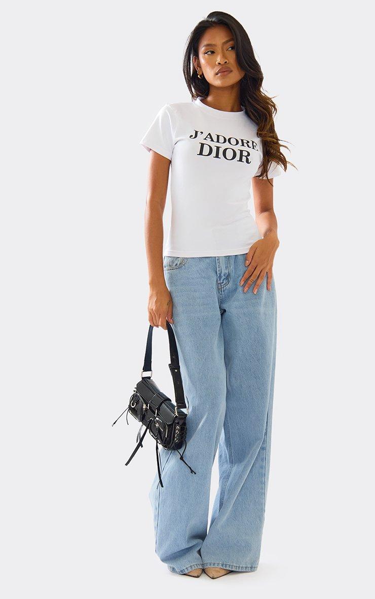 Day-to-night vibes, doll. Featuring a white woven material with short sleeve, crew neck, and J'Adore logo detailing, this top is serving chic, bold energy for a standout look.