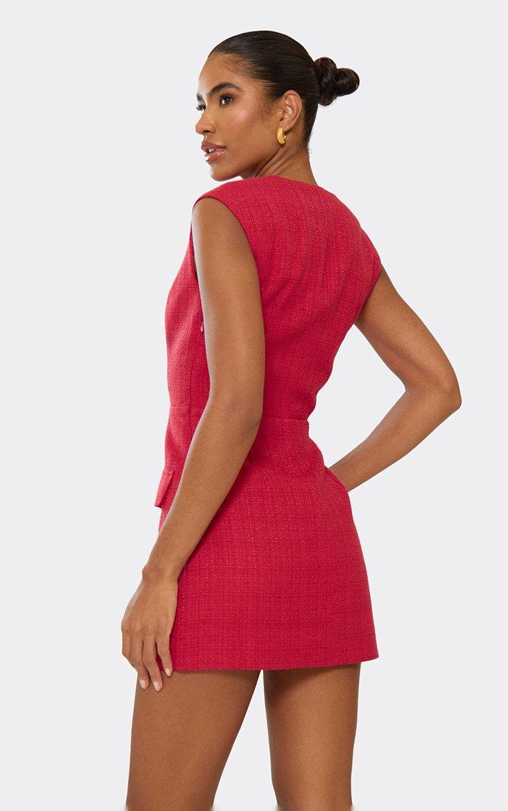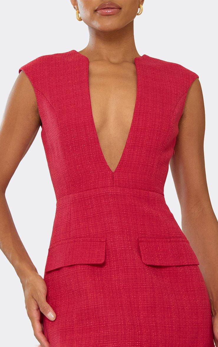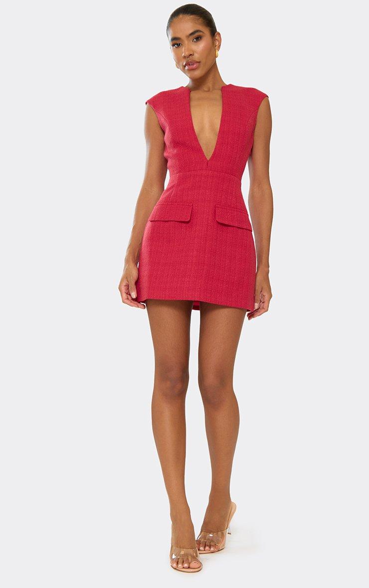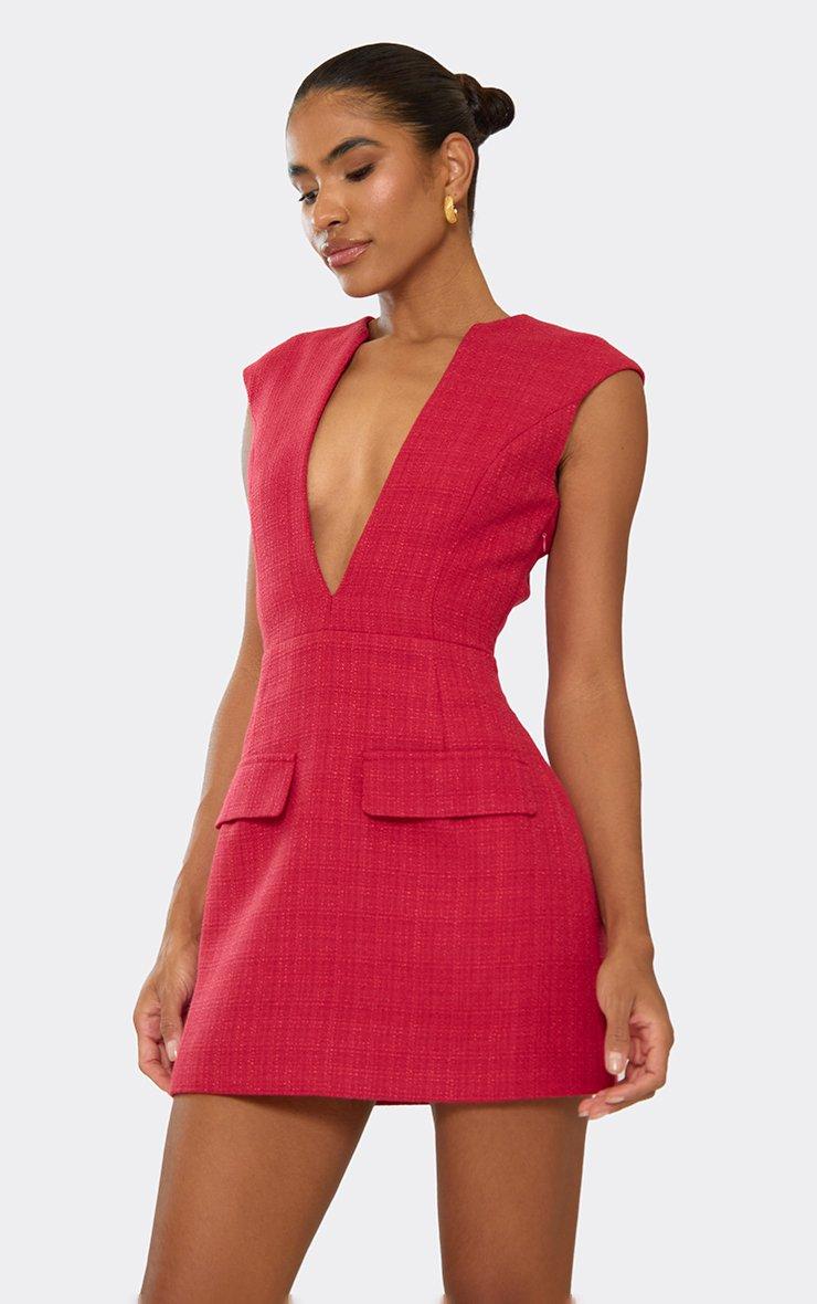 Make a bold statement in this red tweed mini dress, designed with a plunging neckline and sleek pocket detailing for an effortlessly chic look. The red tweed mini dress is perfect for creating a standout evening wear dress code outfits or planning your next show-stopping outfit. Pair with strappy heels and a clutch for dinner or cocktails, or layer with a cropped jacket and statement boots for a more edgy, street-style vibe. Elegant yet playful, this mini dress combines texture, structure, and a flirty fit to keep all eyes on you. Key Features Red Colour Tweed Fabric Plunge Neckline Front Pockets Mini Length