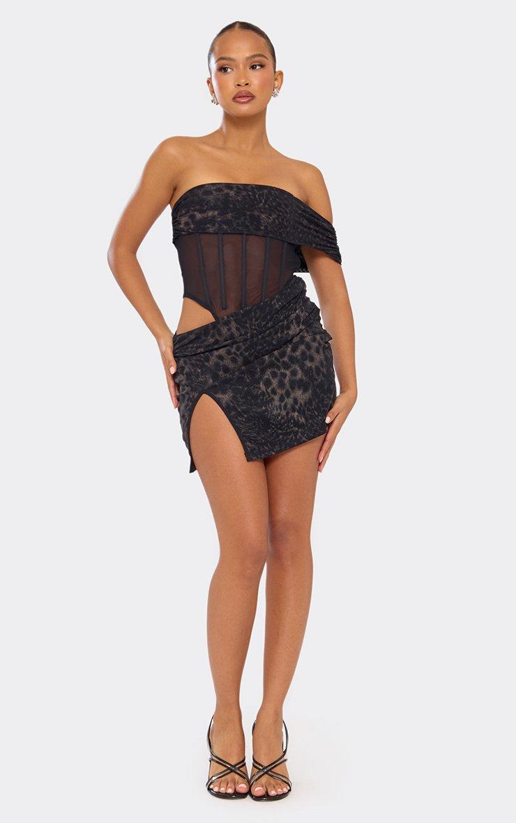 Ready to steal the scene? This black corset bardot dress is your goâto when brunch turns into danceâfloor realness. With fierce black leopard print, a mesh panel for just the right tease, and a corsetâinspired bardot cut that hugs the body, dress delivers major wow energy. Pair our black corset bardot dress with statement heels and gold hoops , and you're set for bottomless brunches, nightâout vibes, or anytime you want to own the room. Key Features Black Colour Leopard Print Fabric OneâShoulder Bardot Neckline Mesh Panel Detailing Corset Style Mini length