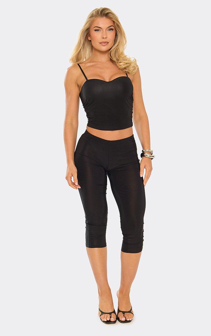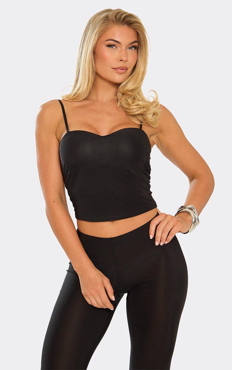 Turn heads, doll. Featuring a black material with strappy and sweetheart neckline detailing, this crop top is serving chic, bold vibes for any night out.