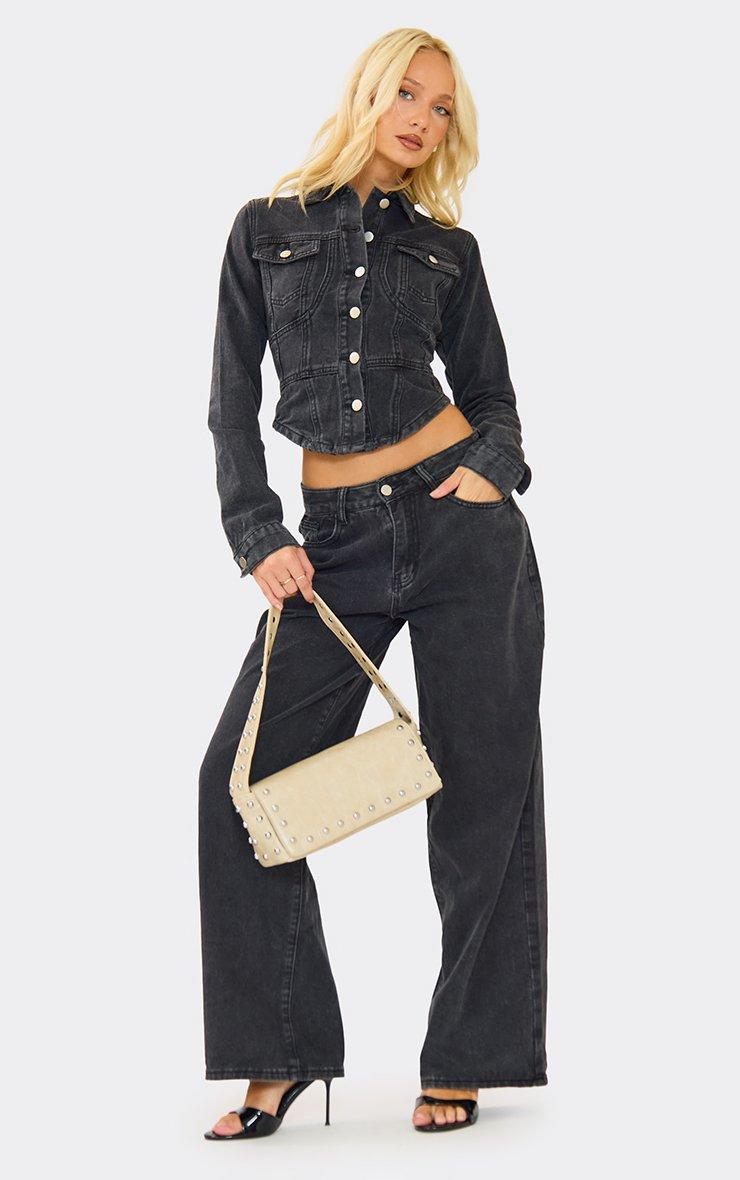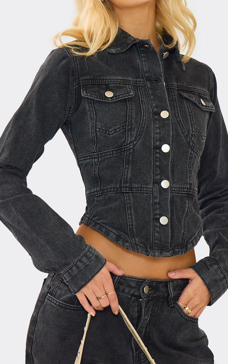 Cinched Waist Curved Hem Button Down Jacket In Black Denim