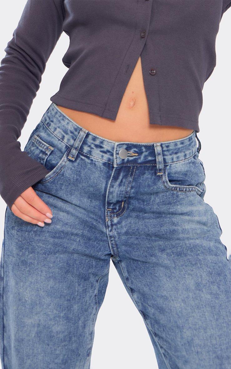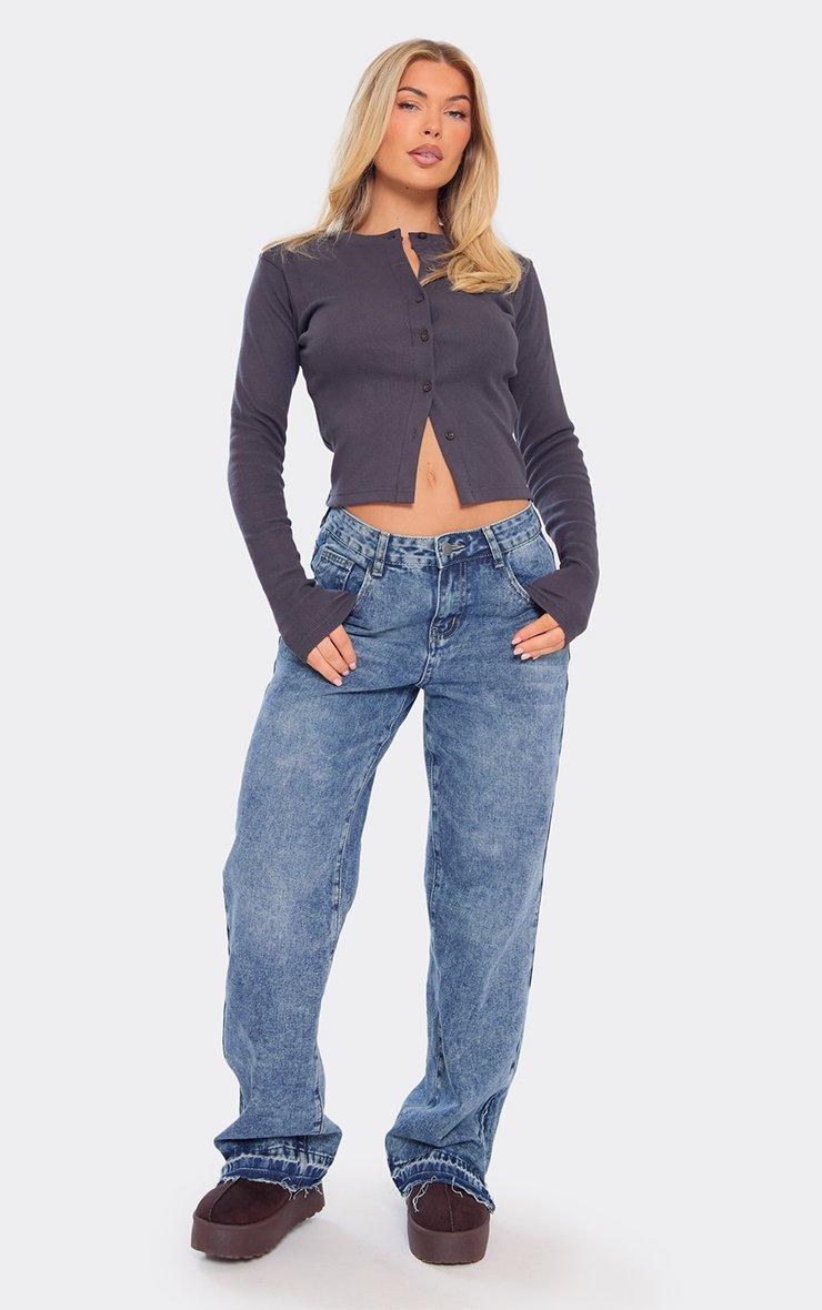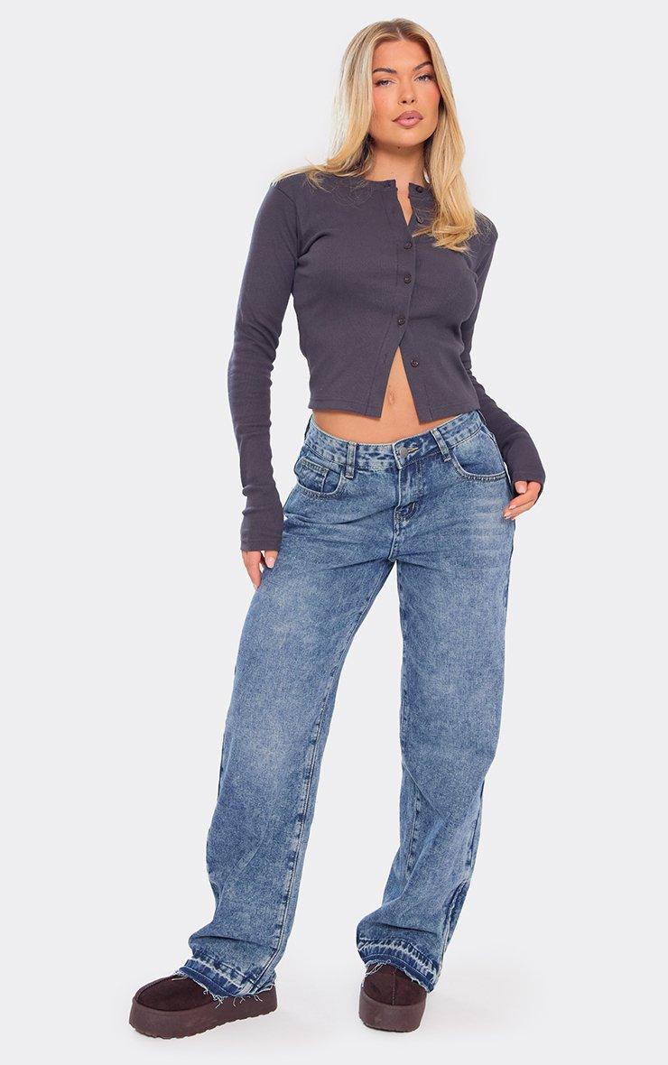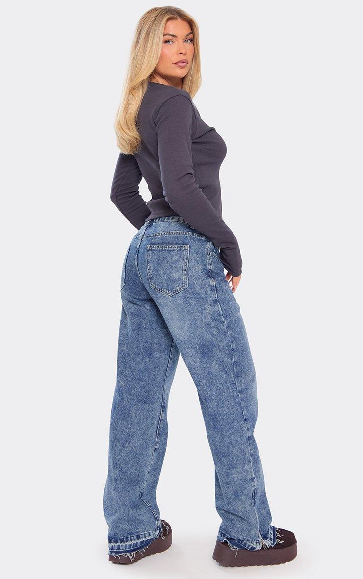 Dipped Distressed Hem Detail Wide Leg Jeans In Washed Blue Denim