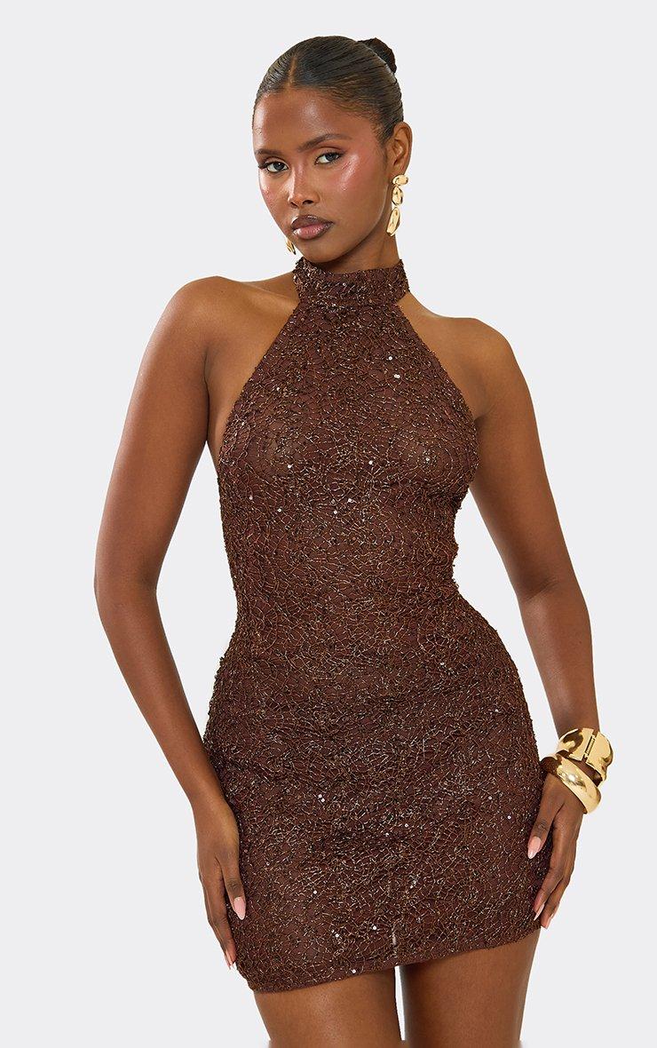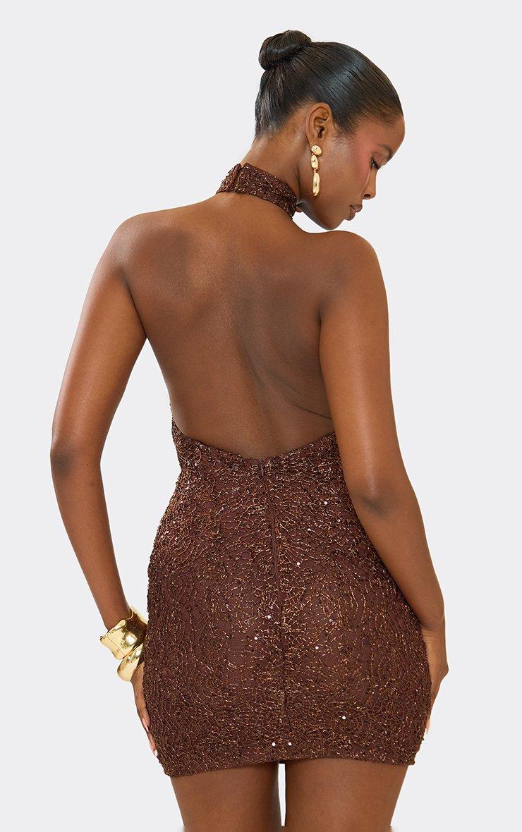 High Neck Open Back Mini Dress In Brown Metallic Texture