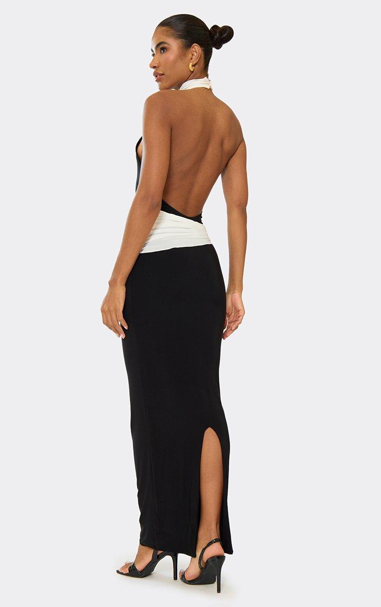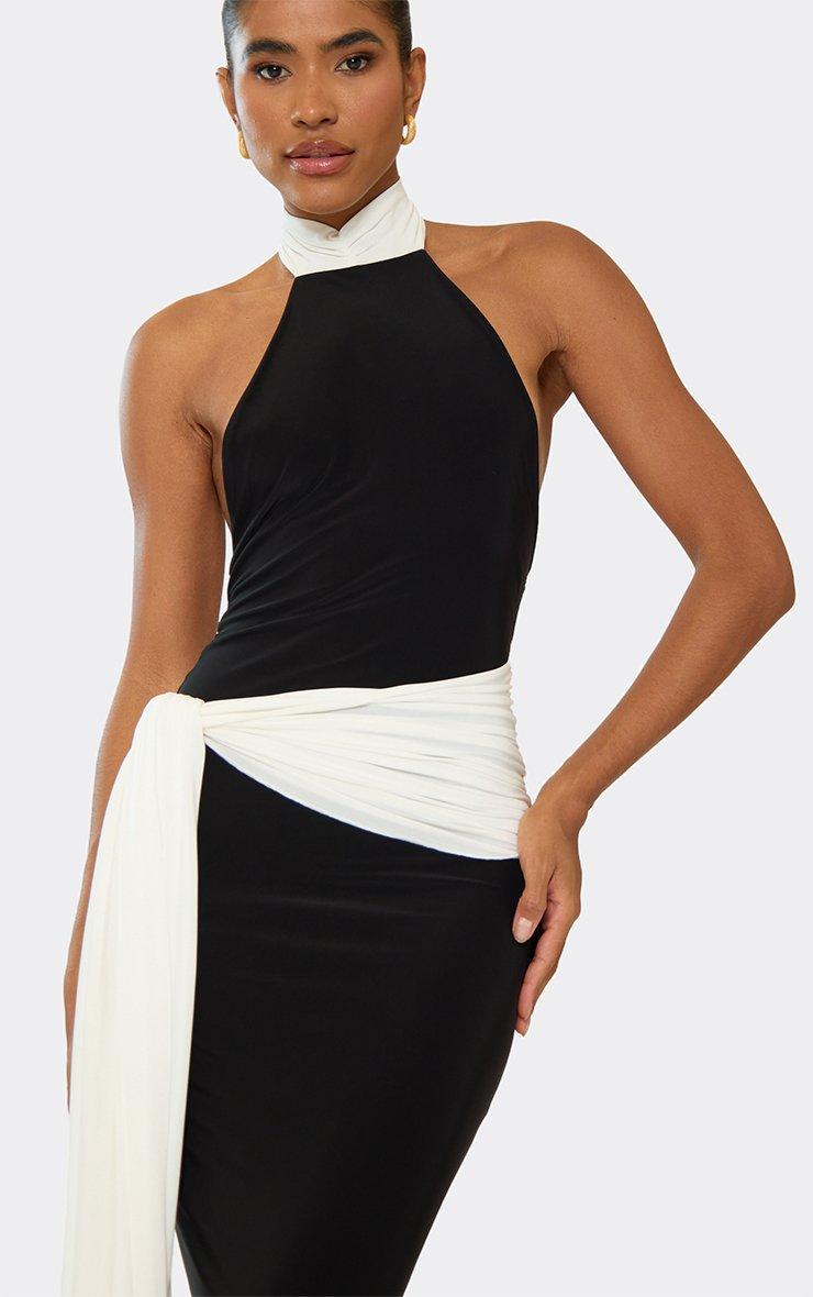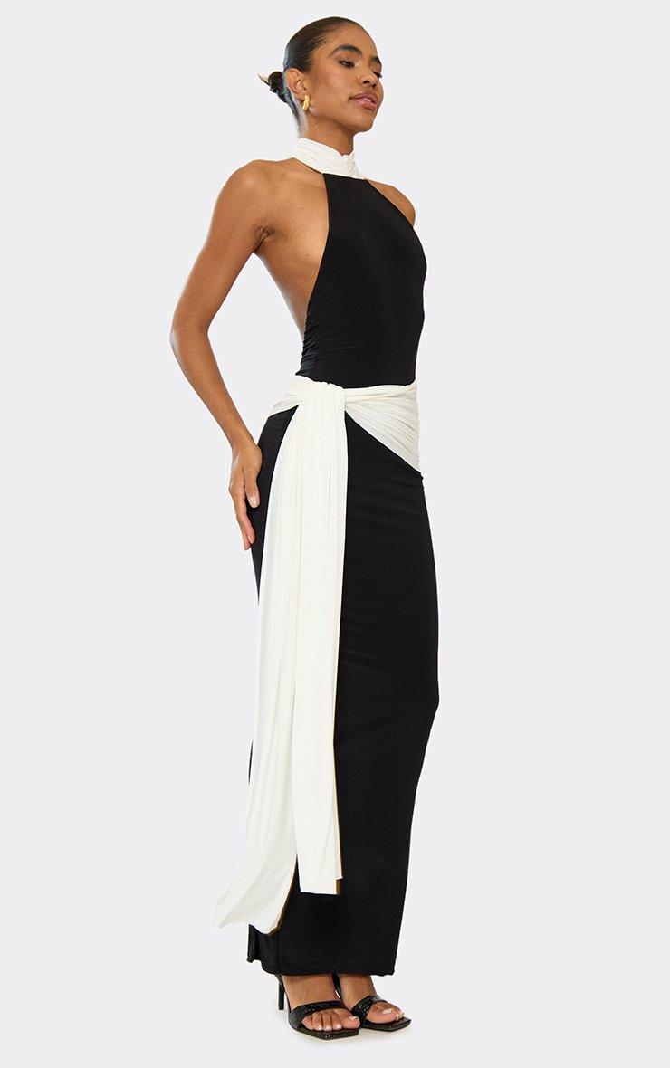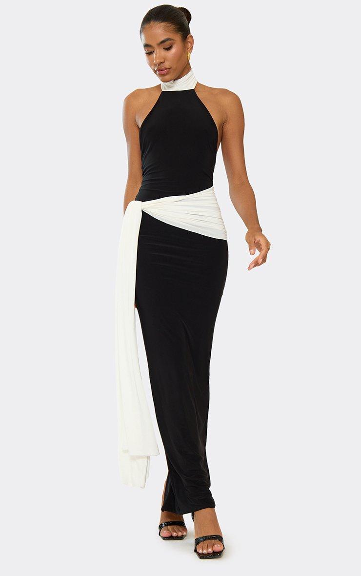 Make a statement at your next black-tie event with this white and black maxi dress. Made in sleek, flowing fabric, it features a high neck and contrast drape detailing for a trendy take on classy fashion. Perfect for occasions with a black tie dress code or a formal evening out, this maxi dress exudes elegance while remaining comfortable to wear. Pair with kitten heels or heeled mules and minimal accessories to let the drape and neckline take centre stage. Ideal for weddings, formal dinners, or any event where standout style is required, this dress combines sophistication with effortless glamour. Key Features White & Black Colour Contrast Drape Detailing High Neckline Maxi Length