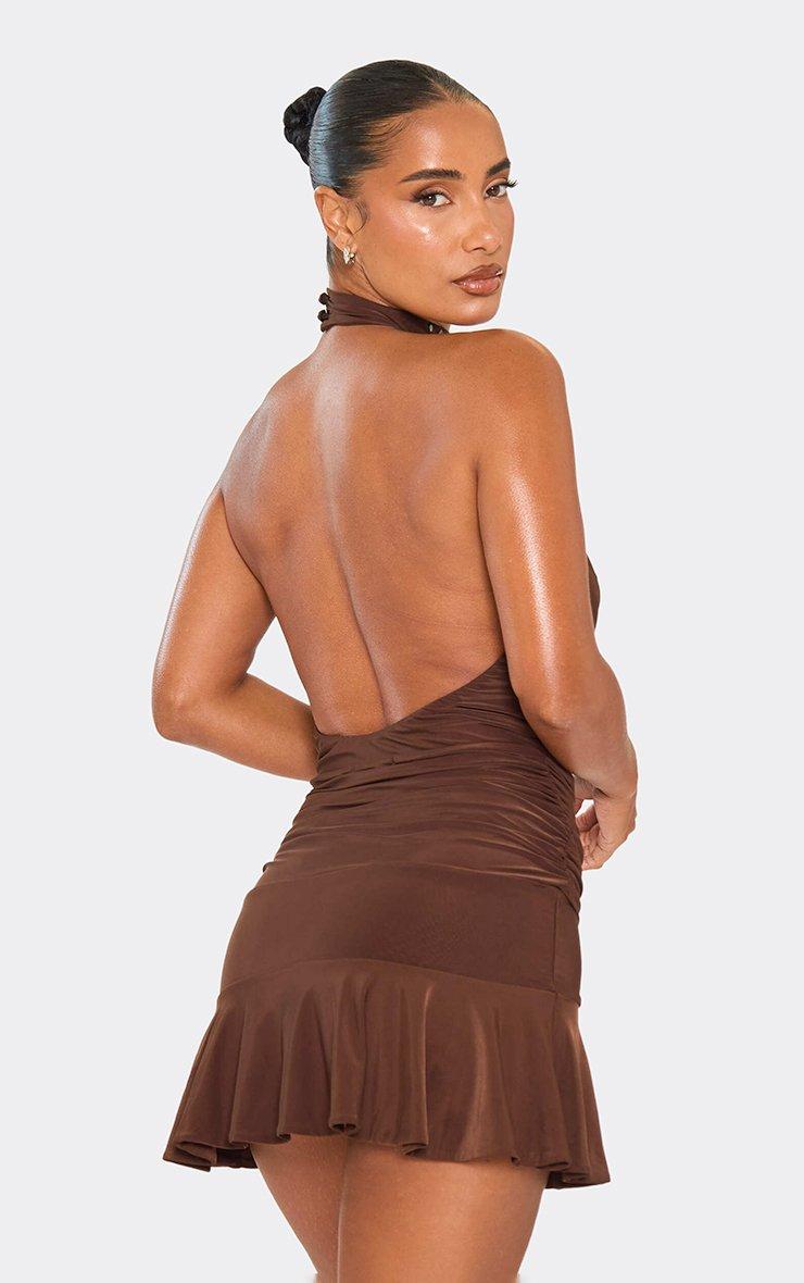 Slide into the spotlight in our chocolate brown cowl neck mini dress, this dress has showâstopper written all over it. The cowl neckline drapes softly, the choker strap brings sweet sass, the stud detailing adds a touch of edge, and the frill hem flutters with every step. Whether you're in need of new going out dress ideas or wanting to own the dance floor from the first song, this brown cowl neck mini dress is made to move and sparkle. Take styling to the next level and pair with metallic heels and a sleek clutch - you're not just arriving, you're making the moment . Key Features Chocolate Brown Colour Slinky Fabric Cowl Neckline Open-Back Detail Choker Strap Studded Detailing Frill Hem Design Mini Length
