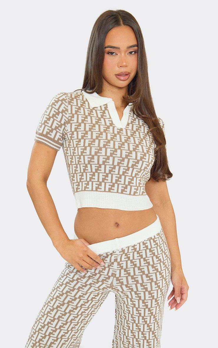 Collared Short Sleeve Logo Pattern Detail Top In Stone Knit