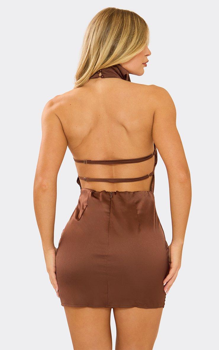 Cowl High Neck Open Back Detail Mini Dress In Chocolate Brown Satin