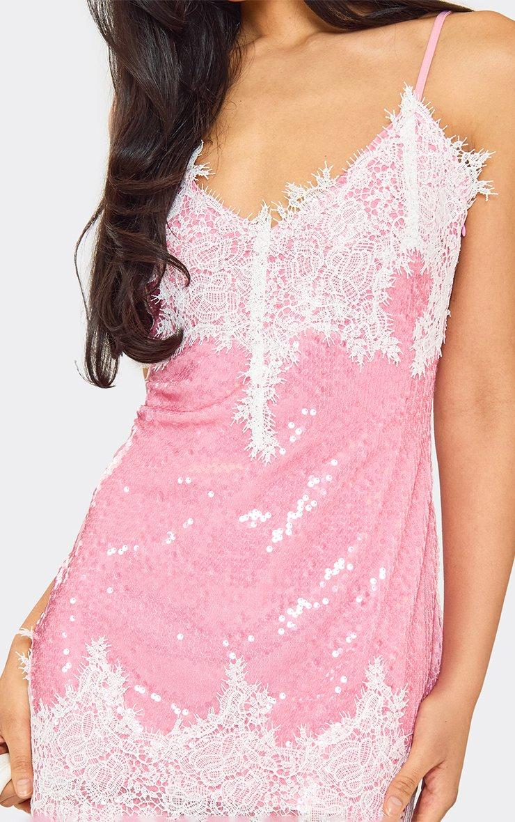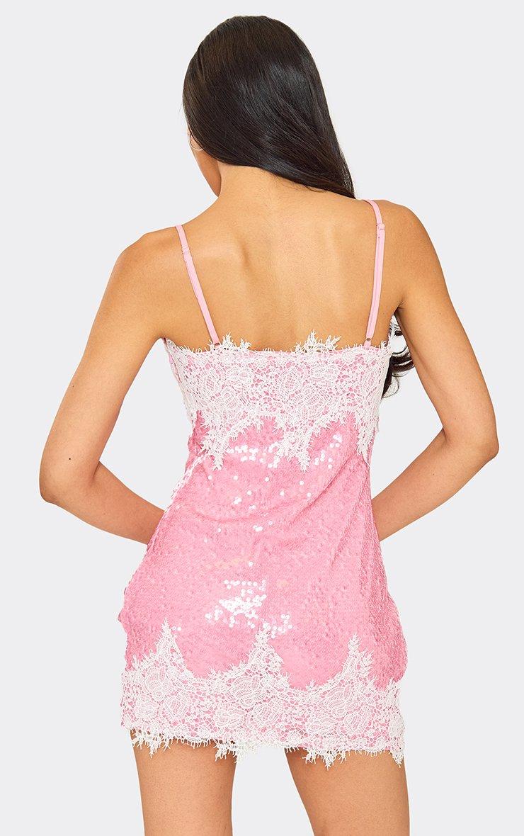 Steal all the stares at your next big event with this ultimate party piece, doll. Featuring a pink sequin material with a daring strappy plunge neck and delicate lace trim detailing, it brings a fresh, it-girl edge to your look. Style with silver lace-up heels and a sleek high pony for a clean-chic aesthetic.