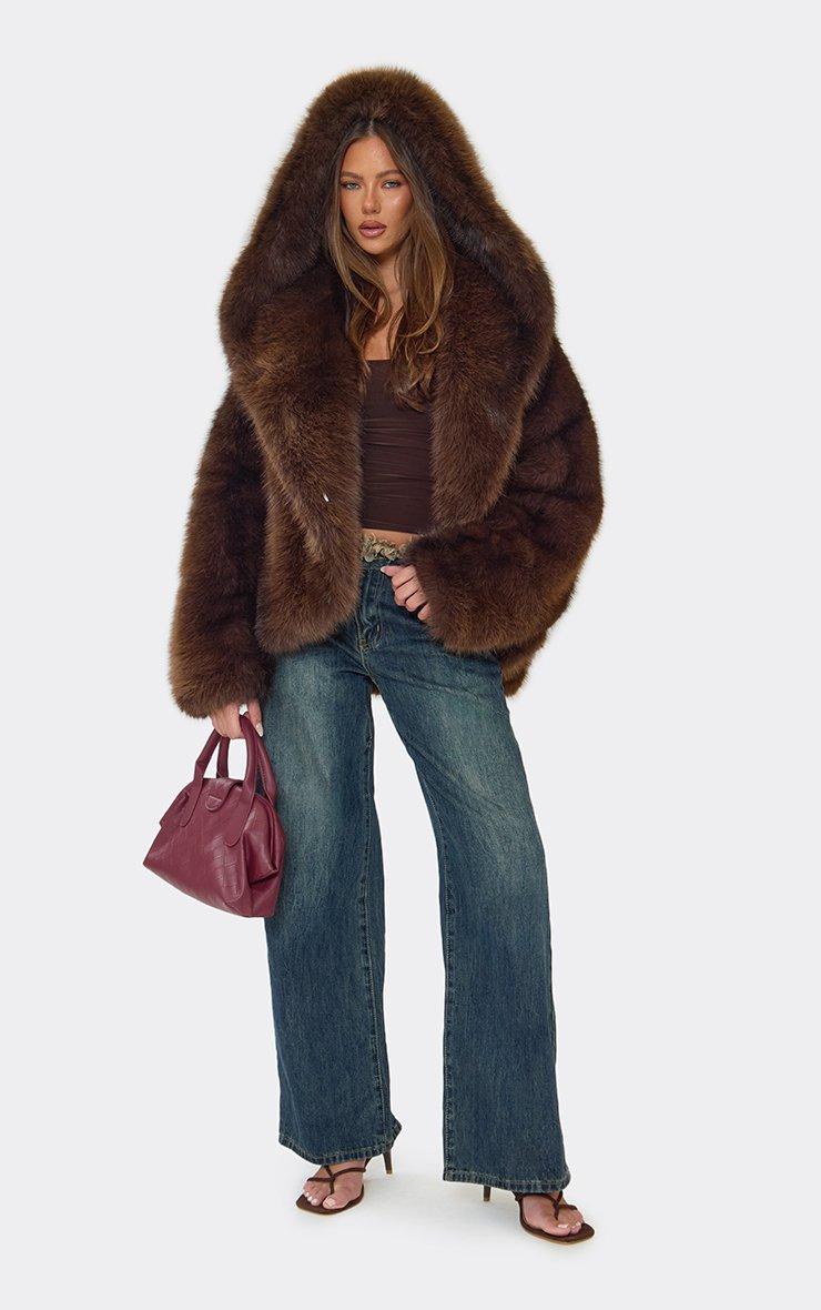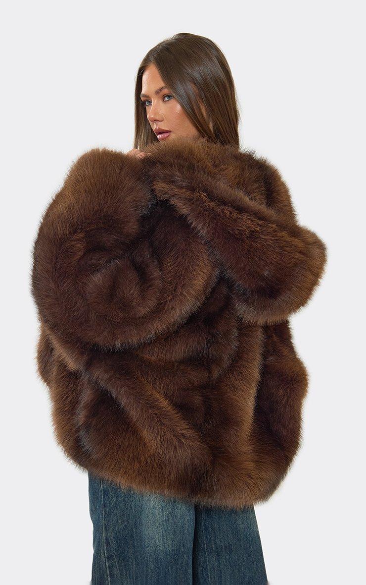Cosy-season vibes, doll. Featuring brown stripe faux fur material with hooded and oversized detailing, this coat adds luxe, it-girl energy to any outfit. Style with skinny jeans and boots for a boss-babe finish.