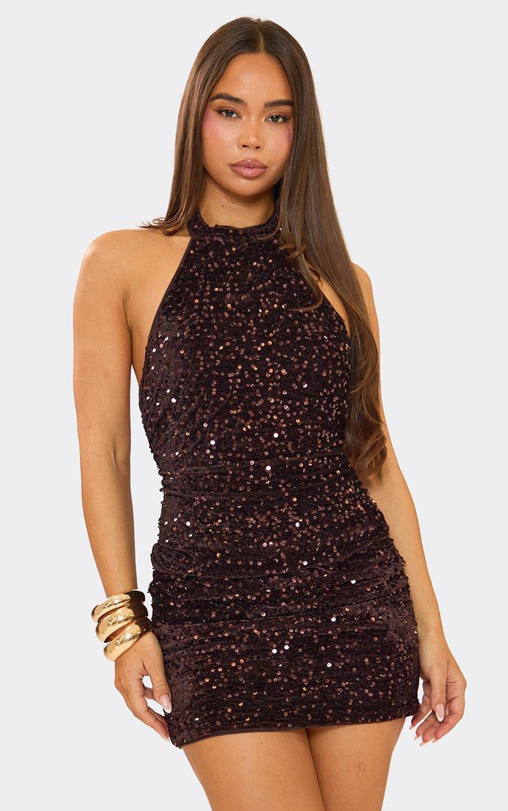 High Neck Fitted Hem Mini Dress In Chocolate Brown Sequin