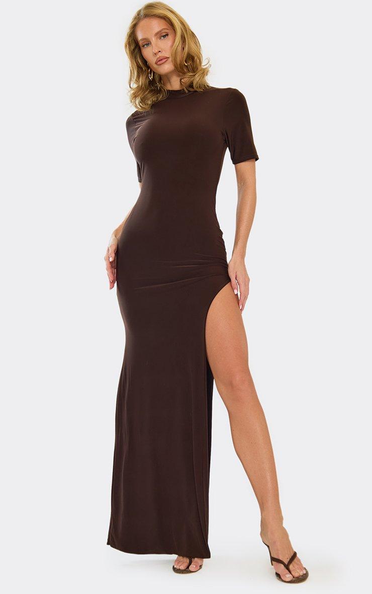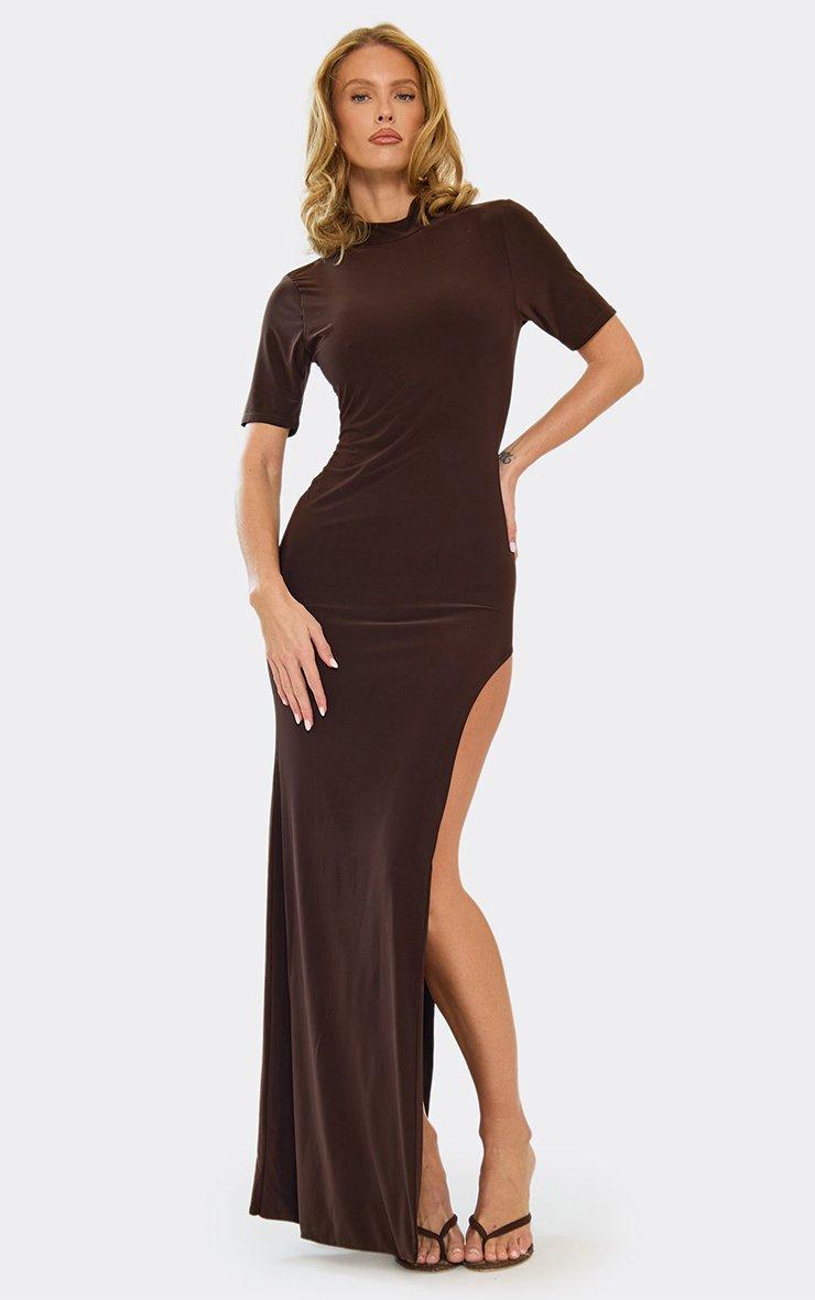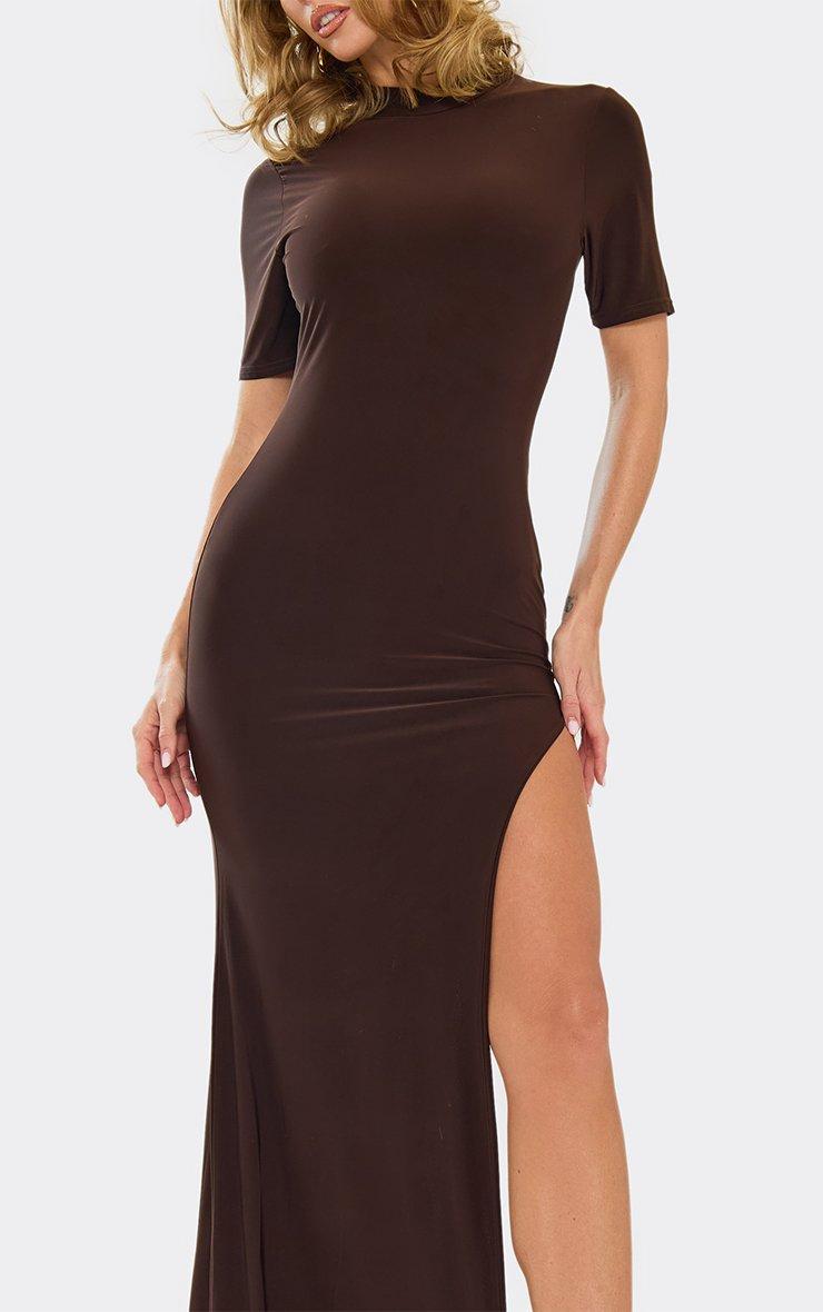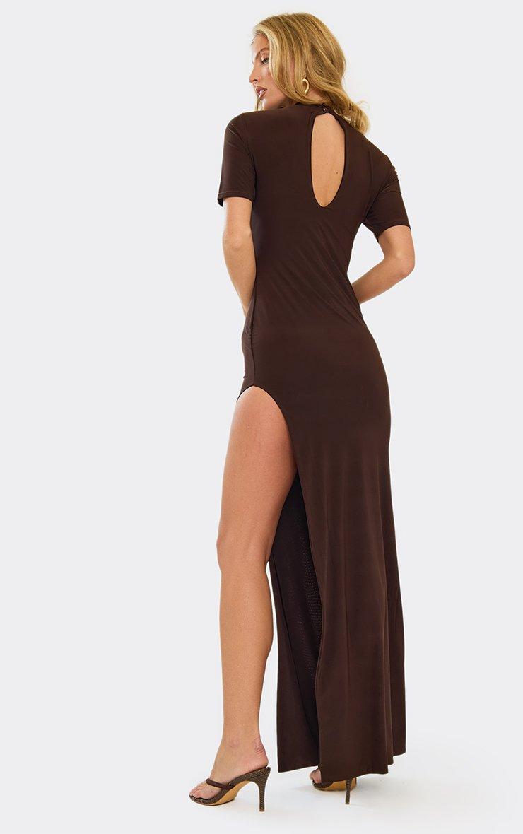 High Neck Short Sleeve Extreme Split Leg Maxi Dress In Chocolate Brown