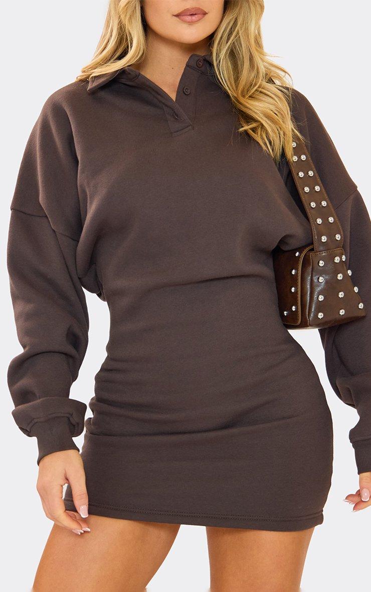 Perfect for cosy-chic vibes, doll. Featuring chocolate brown material with button-down and collar detailing, this jumper dress brings relaxed it-girl energy. Style with knee-high boots or trainers for boss-babe looks.