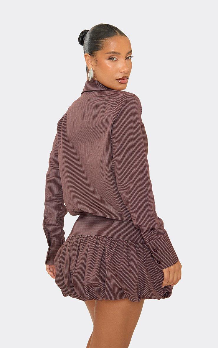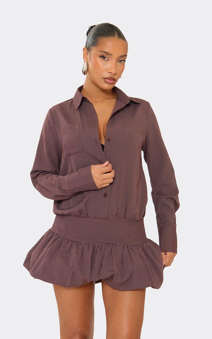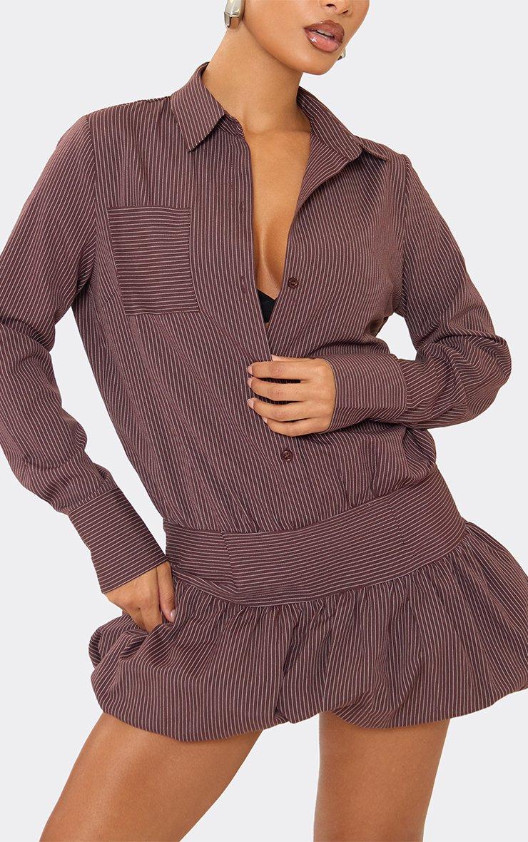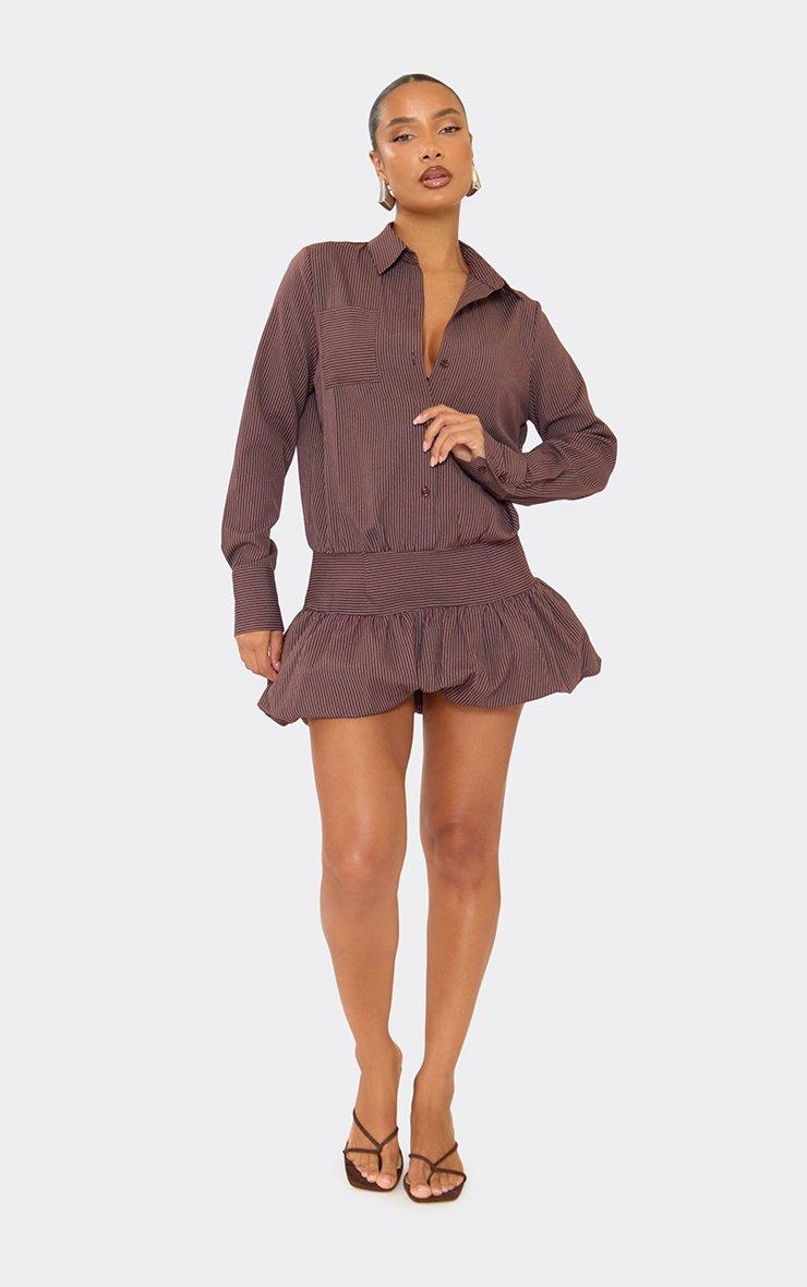 Long Sleeve Puffball Hem Shirt Dress In Chocolate Brown Pinstripe