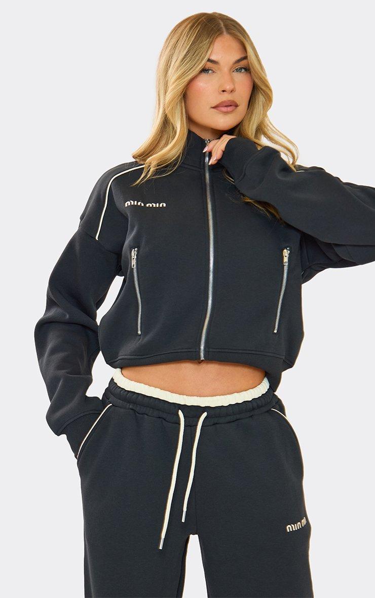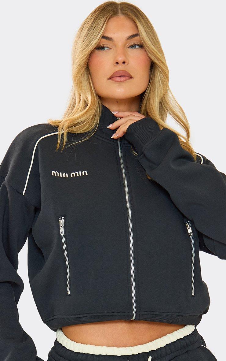 Keep off-duty vibes on-trend, doll. Featuring navy blue material with contrast piping, Min Min embroidered graphic, and zip-up detailing, this sweatshirt brings relaxed it-girl energy. Style with joggers or jeans for boss-babe looks.