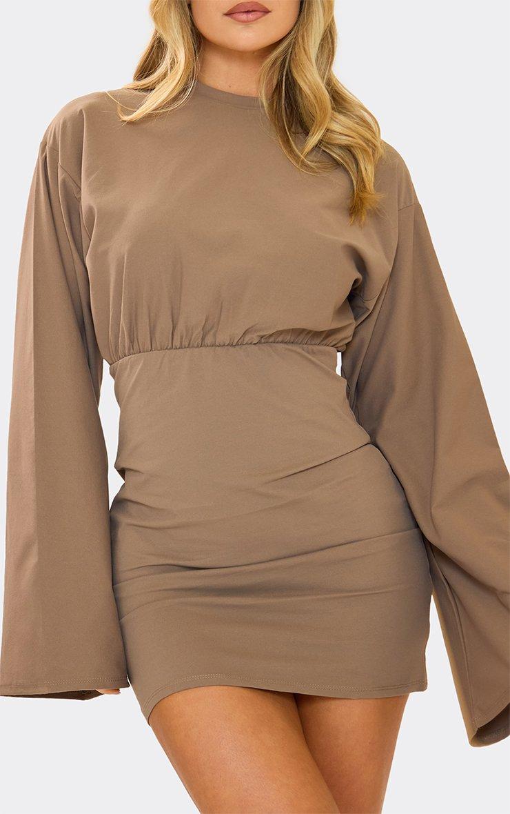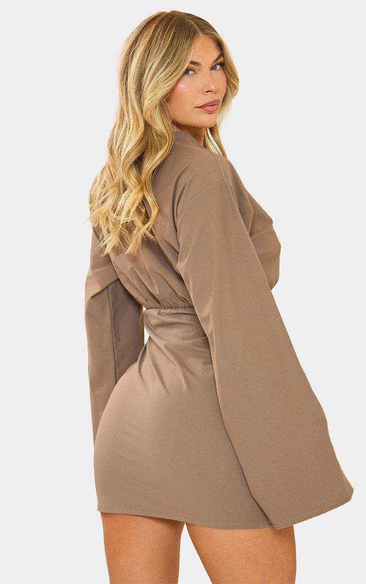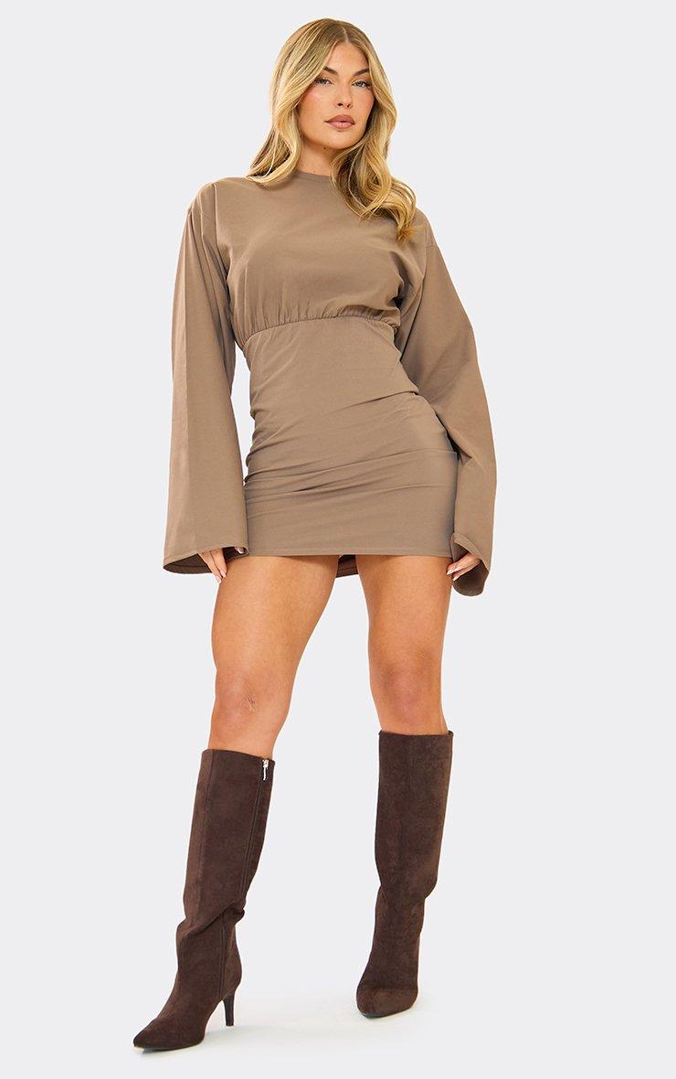Bring understated elegance to your wardrobe with the light brown long sleeve dress, designed to combine comfort and chic detailing. Featuring flared sleeves and a ruched under-bust seam, this mini dress adds subtle texture while highlighting your silhouette. Style the light brown long sleeve dress with a shoulder bag , thong-strap heeled mules , and delicate jewellery for a polished finish that works across multiple occasions. Perfect for brunches, casual evenings, or semi-formal events, this dress is a versatile piece for exploring different types of dresses in your collection. Key Features: Flared Long Sleeve Detail Ruched Under-Bust Seam Mini Length Light Brown Fabric Textured, Feminine Finish