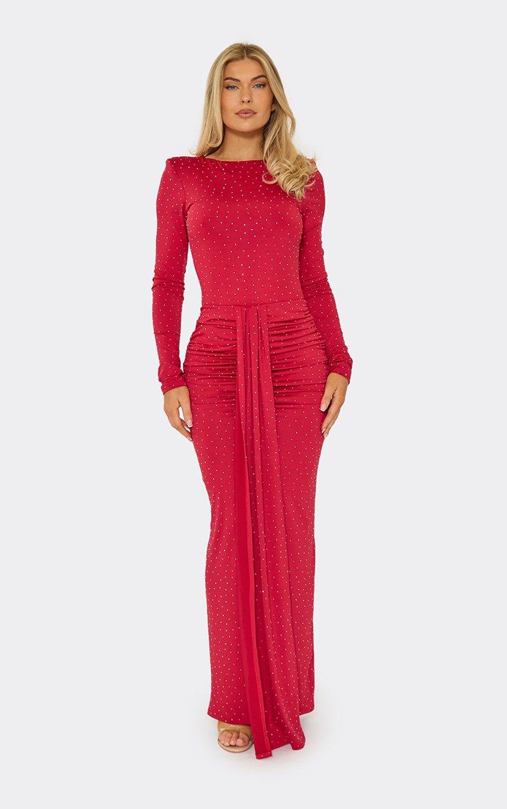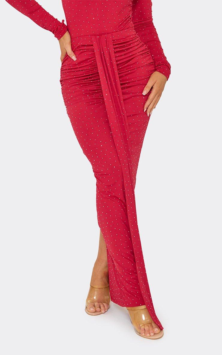 Drape Detail Hotfix Embellished Maxi Skirt In Red
