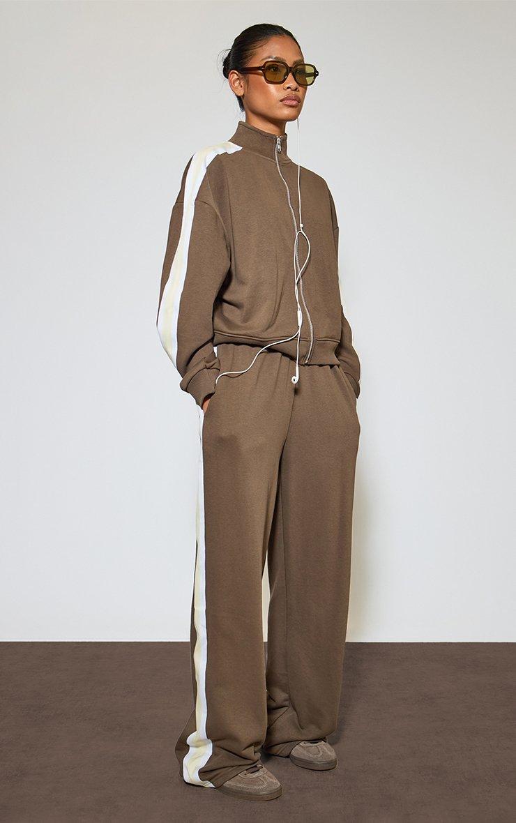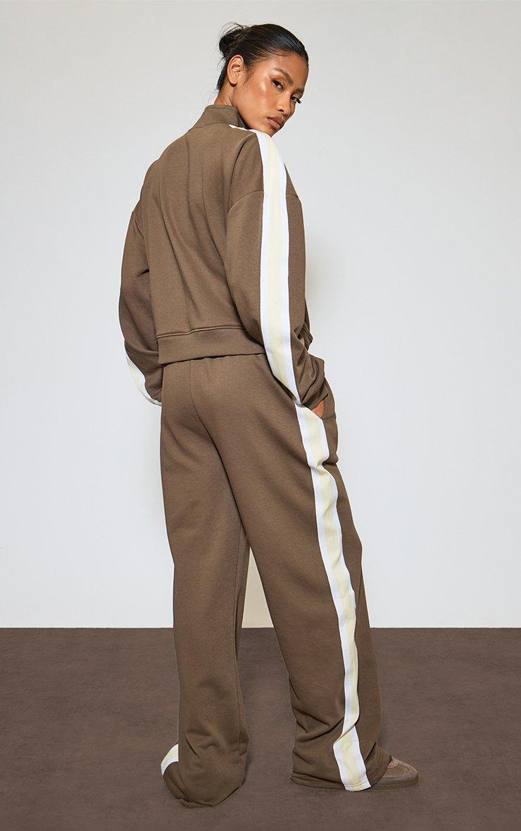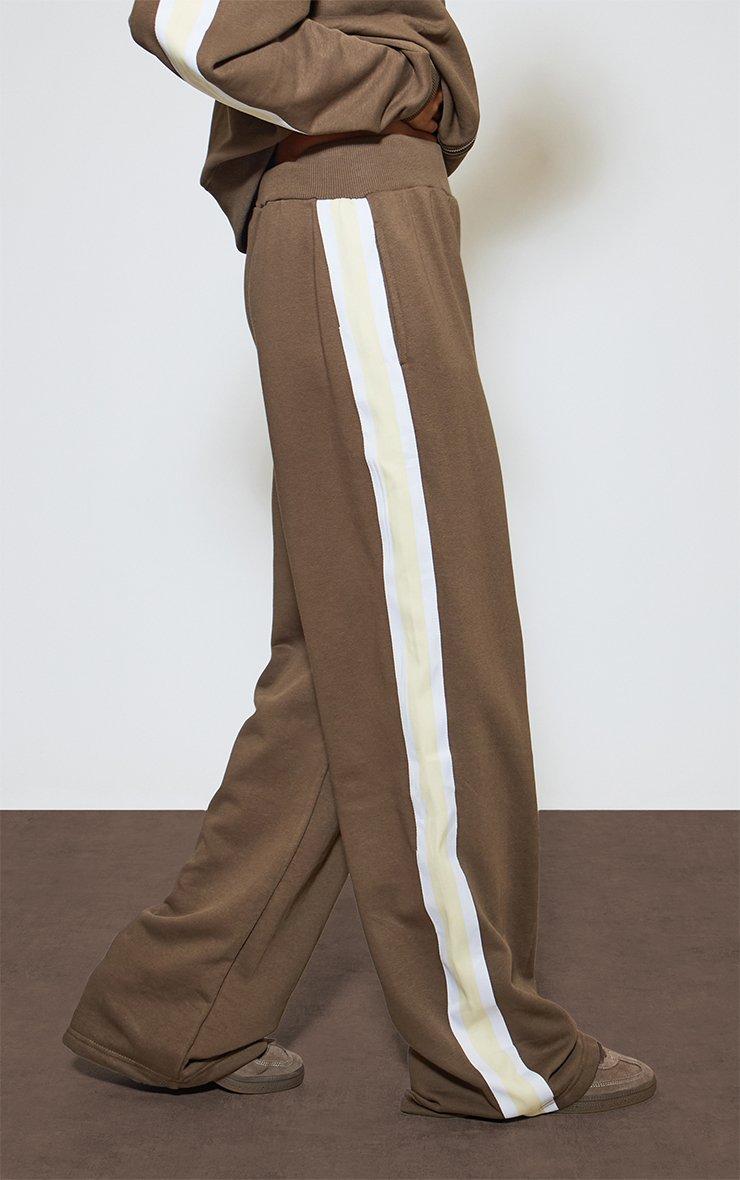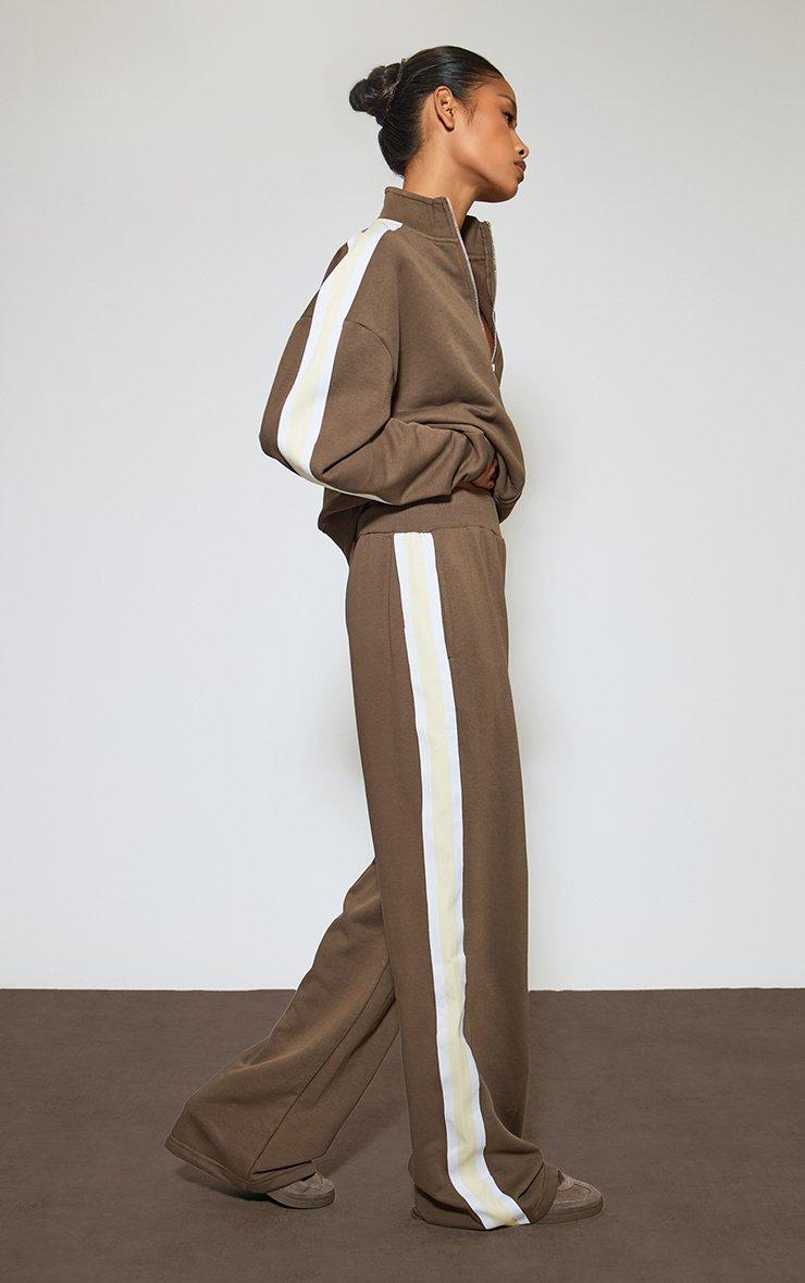 Upgrade your terminal style with these brown side stripe wide leg trousers, a piece that perfectly balances a relaxed fit with a sharp aesthetic. These joggers feature a mid-rise waist and a dramatic wide-leg cut, accented by a bold contrast stripe for a hit of retro-inspired energy. These brown side stripe wide leg trousers are an essential addition to your rotation of travel outfits, offering a lightweight feel that stays comfortable during long-haul flights. The chocolate hue provides a rich alternative to classic black, ensuring you look curated from check-in to arrival. Style these lounge bottoms with a matching zip-up hoodie and mini boots for the ultimate coordinated airport look. Key Features Chocolate Brown Fabric Contrast Side Stripe Detail Mid-Rise Elasticated Waist Wide-Leg Silhouette Soft-Touch Material