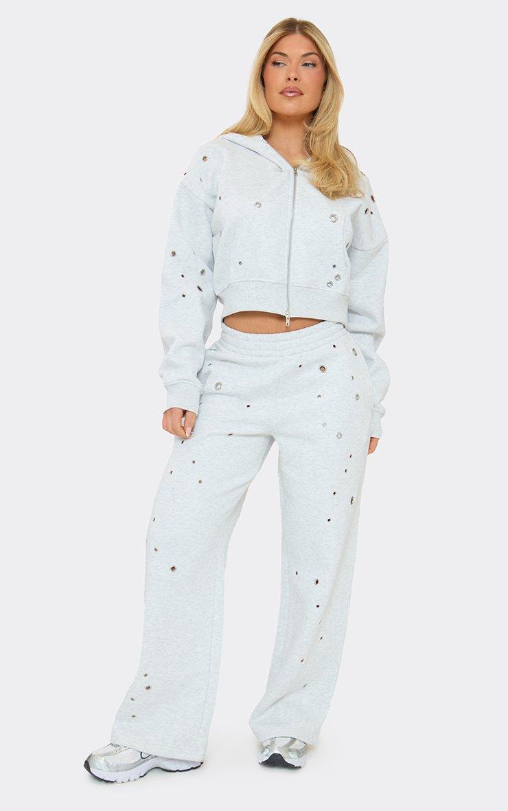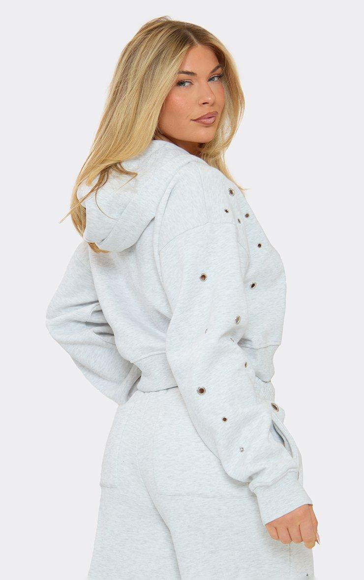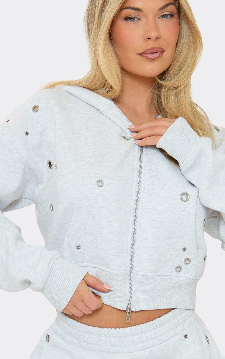 Level up your off-duty look, doll. Featuring light grey marl material with eyelet detailing and a boxy zip-up fit, this hoodie is a total mood. Style with matching joggers and fresh kicks for a high-end, it-girl aesthetic.