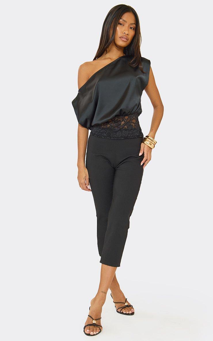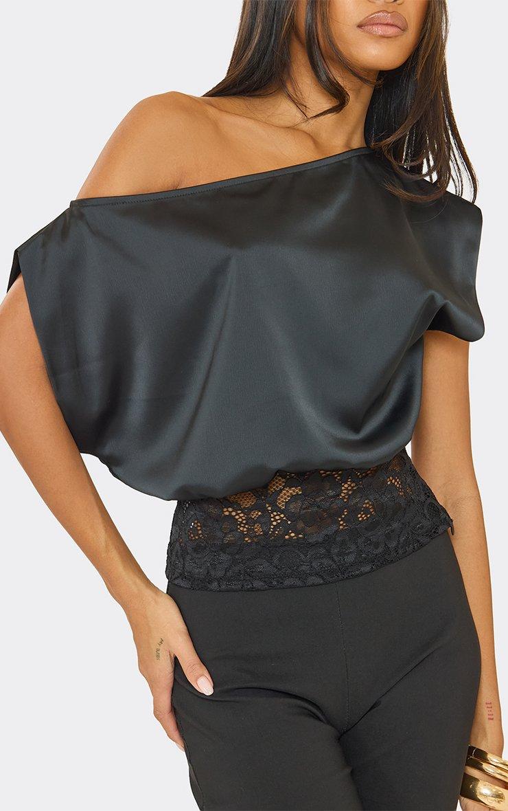 Set the vibe for your next date night with a look that’s totally iconic. Featuring black satin material with off the shoulder and lace hem detailing, this top is a literal dream. Style with flared trousers and pointed heels for a total boss-babe look.