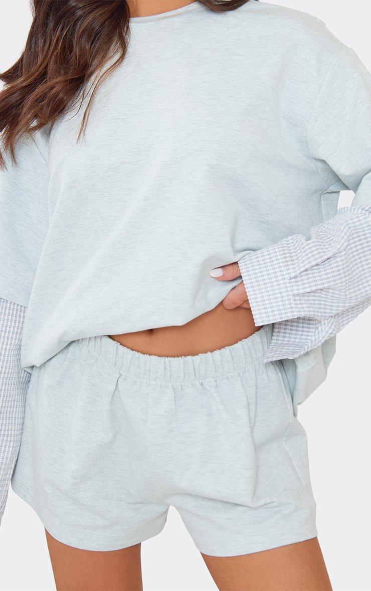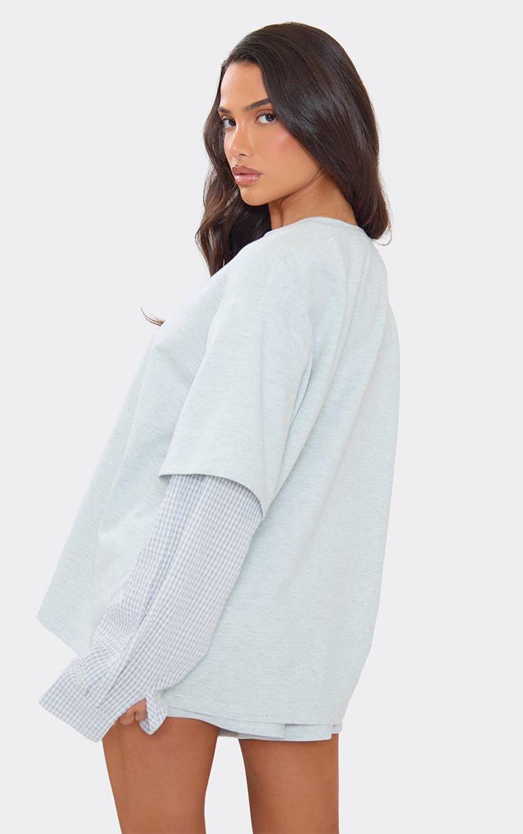 Level up your off-duty layering game with this must-have. Featuring light grey marl material with long checkered sleeve and layered detailing, it is a total vibe. Style with the matching shorts or trousers and fresh kicks for the ultimate it-girl fit.