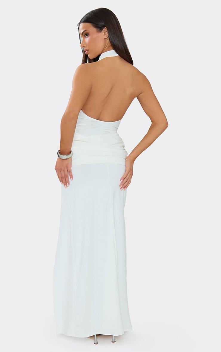 A total ethereal-chic vibe, doll. Featuring a cream material with a sharp racer neck, a flattering maxi length, and luxe draped ruched detailing, this dress is a serious mood. Style with gold layered necklaces and some strappy heeled sandals for a polished, high-glam aesthetic.