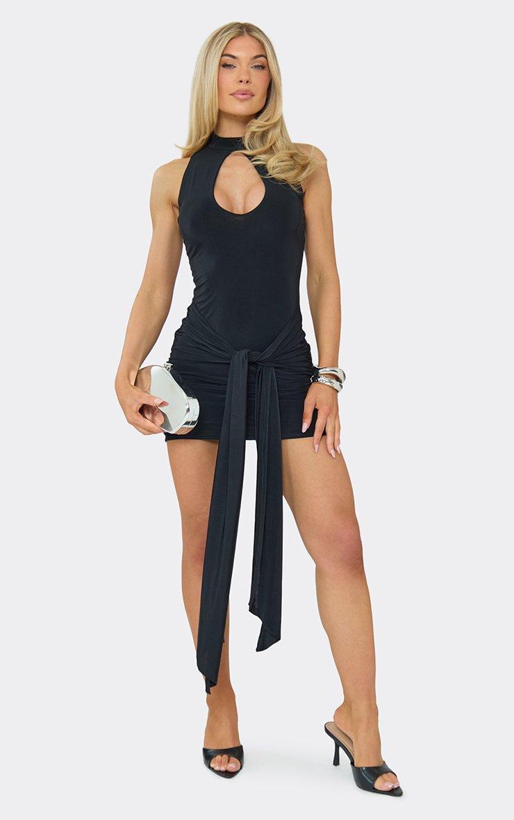 The ultimate after-dark essential, doll. Featuring black slinky material with a chic high neck, keyhole cut out, and elegant drape detailing, this mini dress is a total mood. Style with silver wrap-around heels and a sleek bun for a high-fashion, club-ready aesthetic.