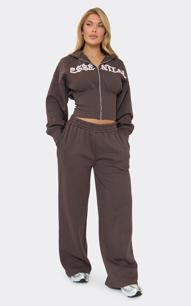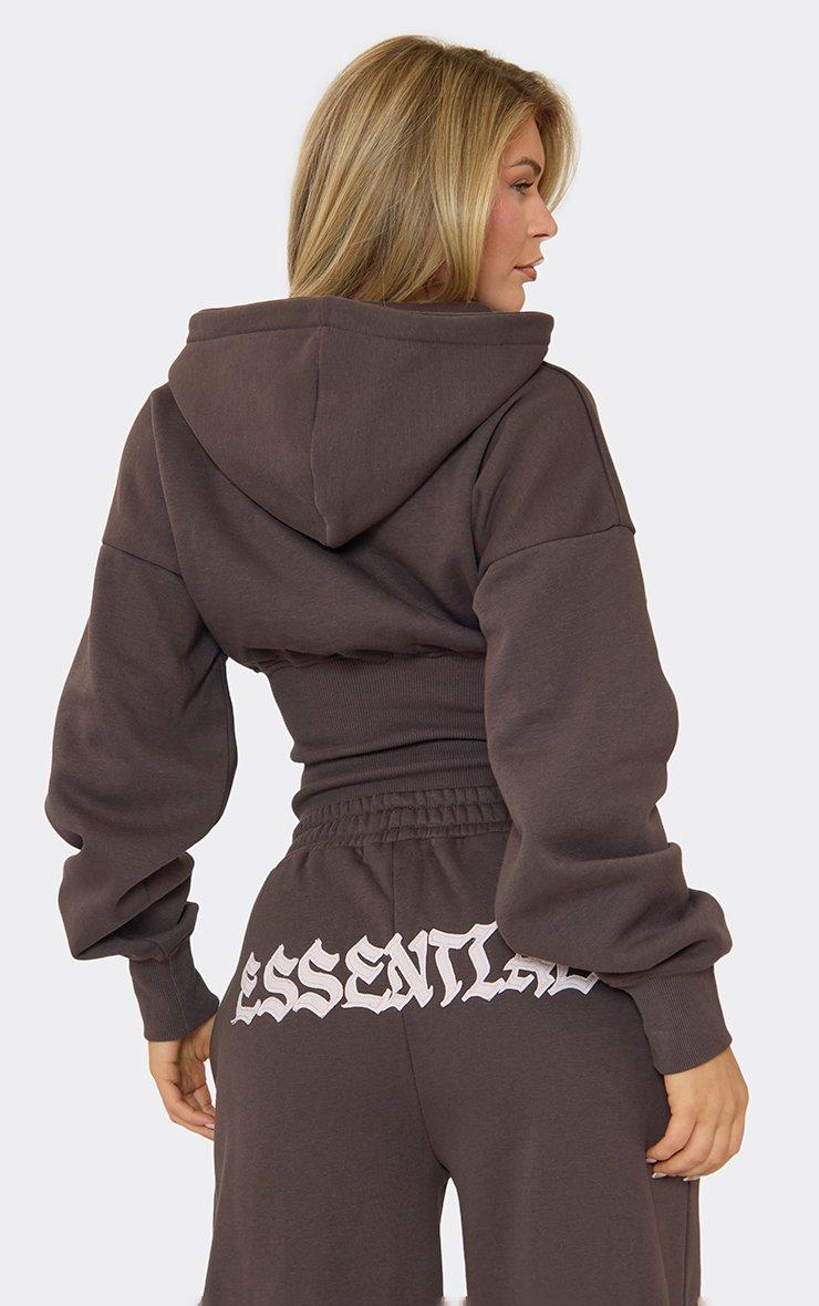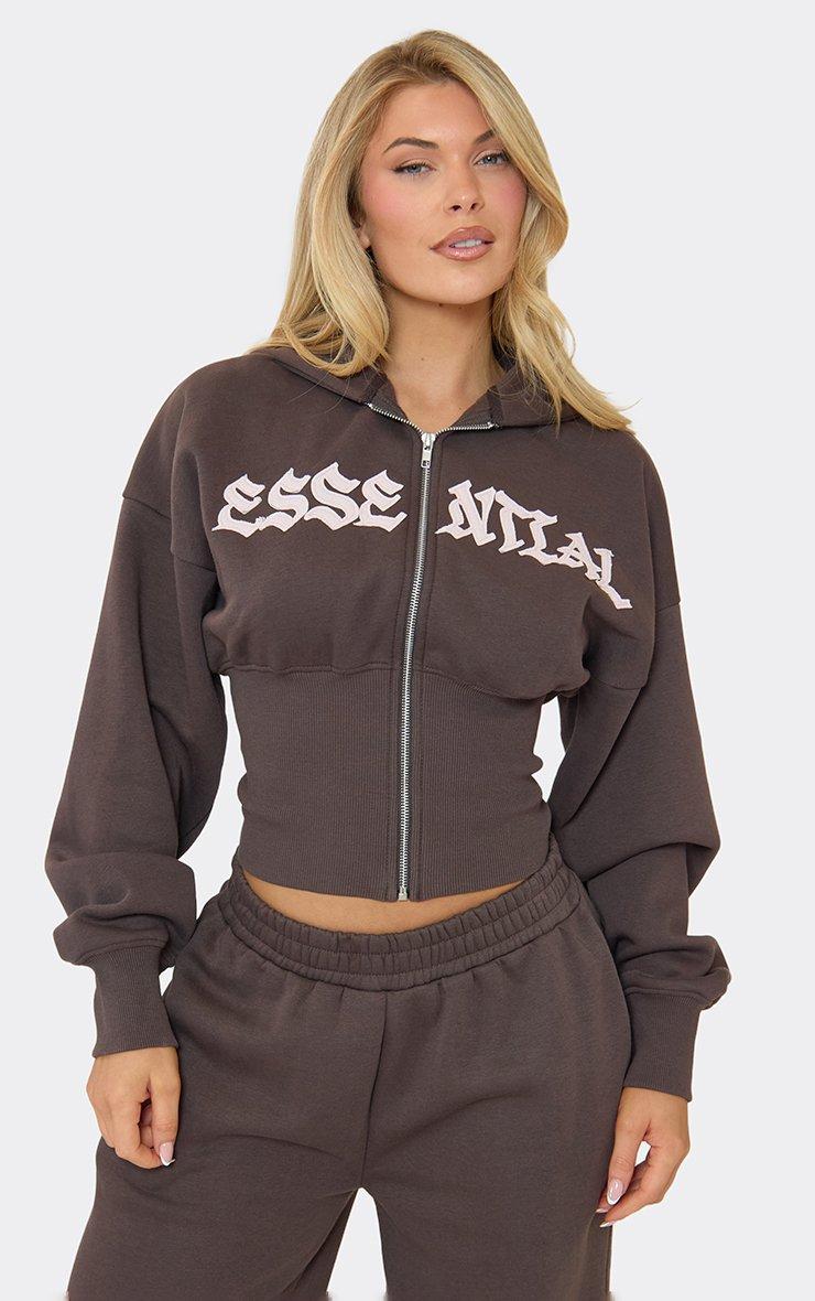 Slay the street-style game in this seasons must-have layer, perfect for those chilled city walks. Featuring chocolate brown sweat material with graphic detailing, a zip-up front and a cinched waist to snatch your silhouette.
