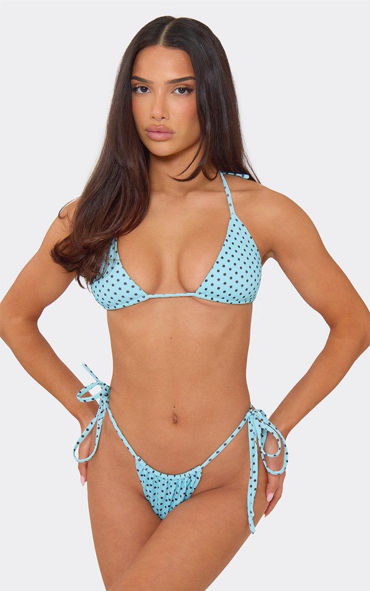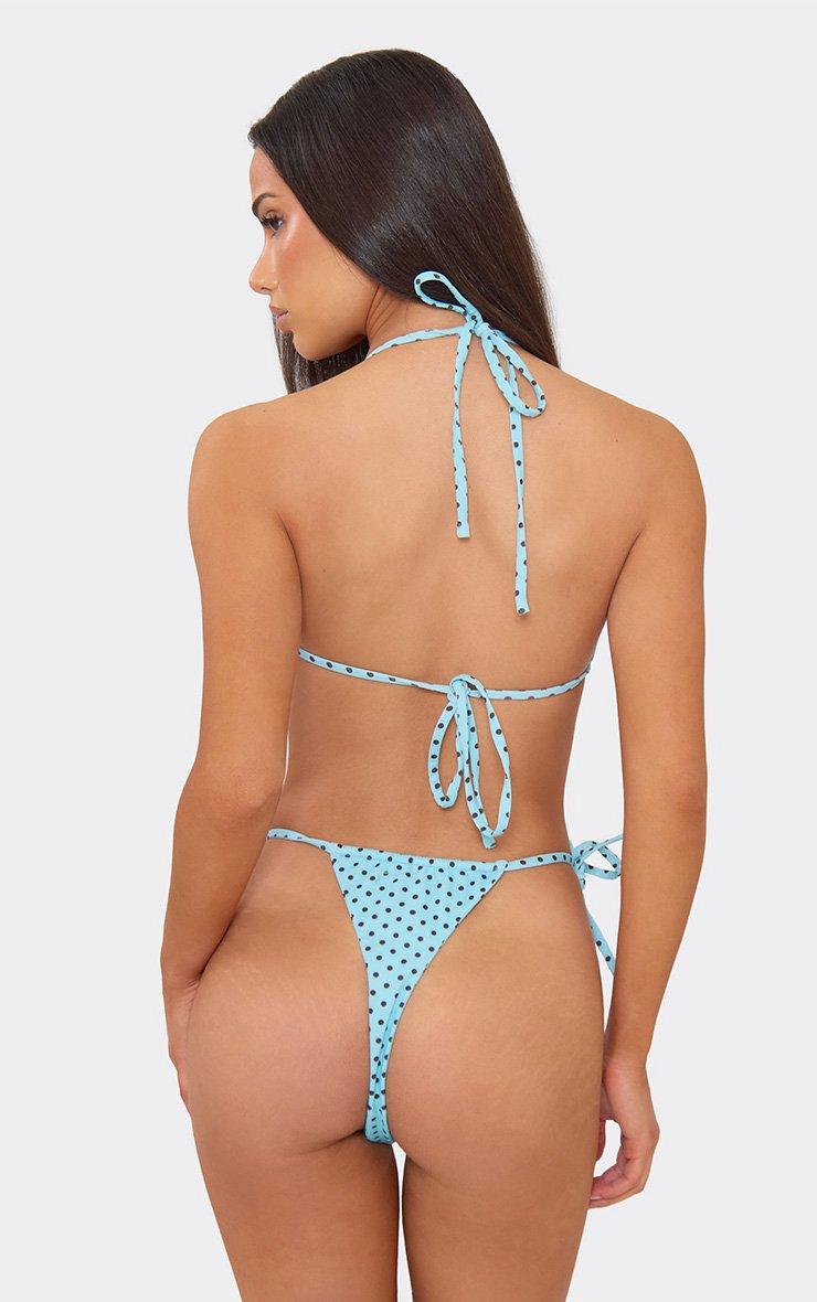 Make a splash in blue polka dot material featuring a classic triangle bikini top. This sharp, high-octane bikini set delivers a total "retro-beach" aesthetic for a major it-girl finish. Style with a white crochet cover-up and silver jewelry for a polished vibe.