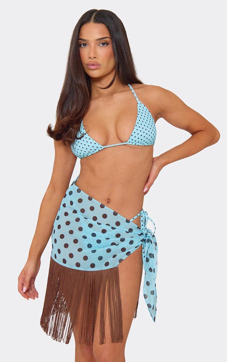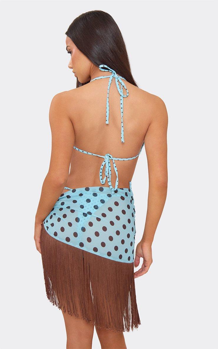 Level up your holiday rotation in blue polka dot material featuring a tie side fit and contrast tassel hem detailing. This sharp, high-octane sarong delivers a total "retro-beach" aesthetic for a major it-girl finish. Style with the matching triangle bikini and silver jewelry for a polished vibe.