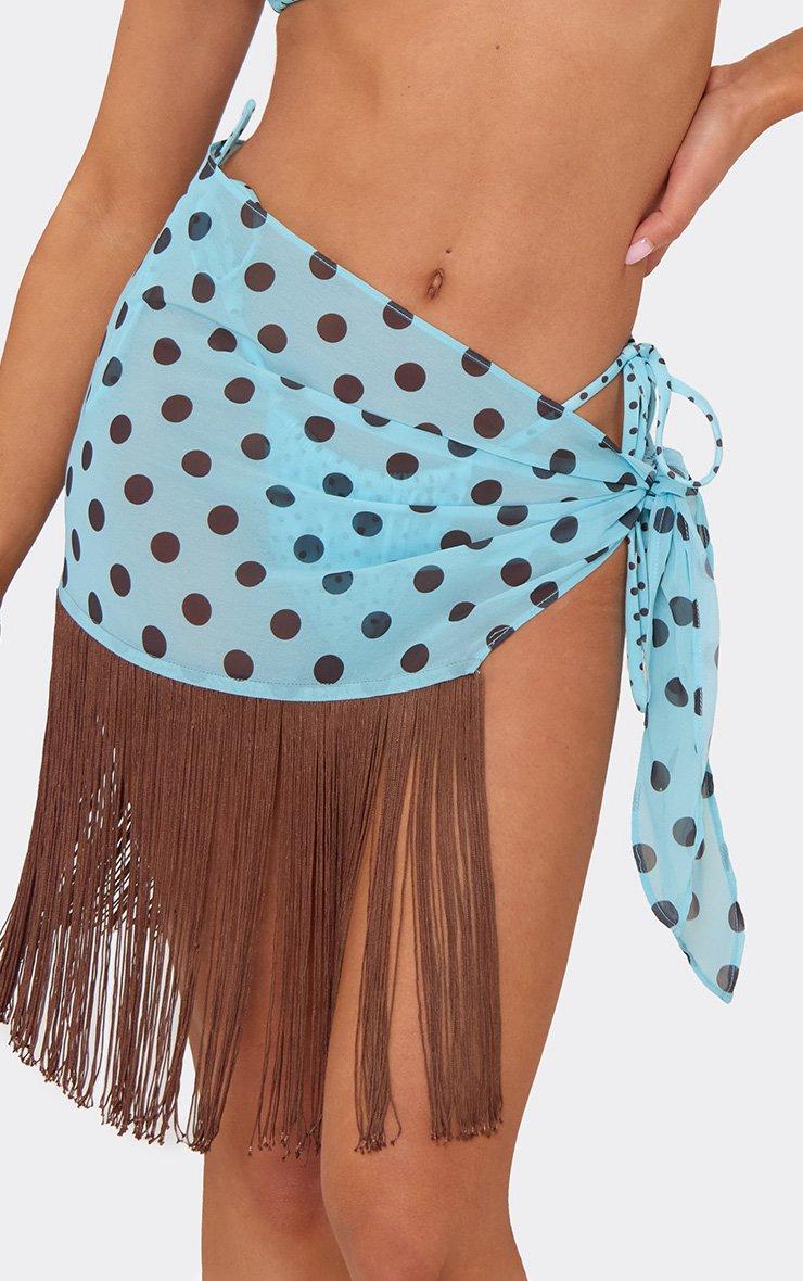 Tie Side Contrast Tassel Hem Sarong In Blue Polka Dot