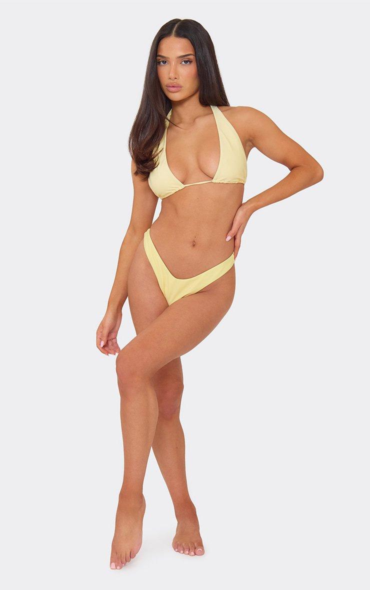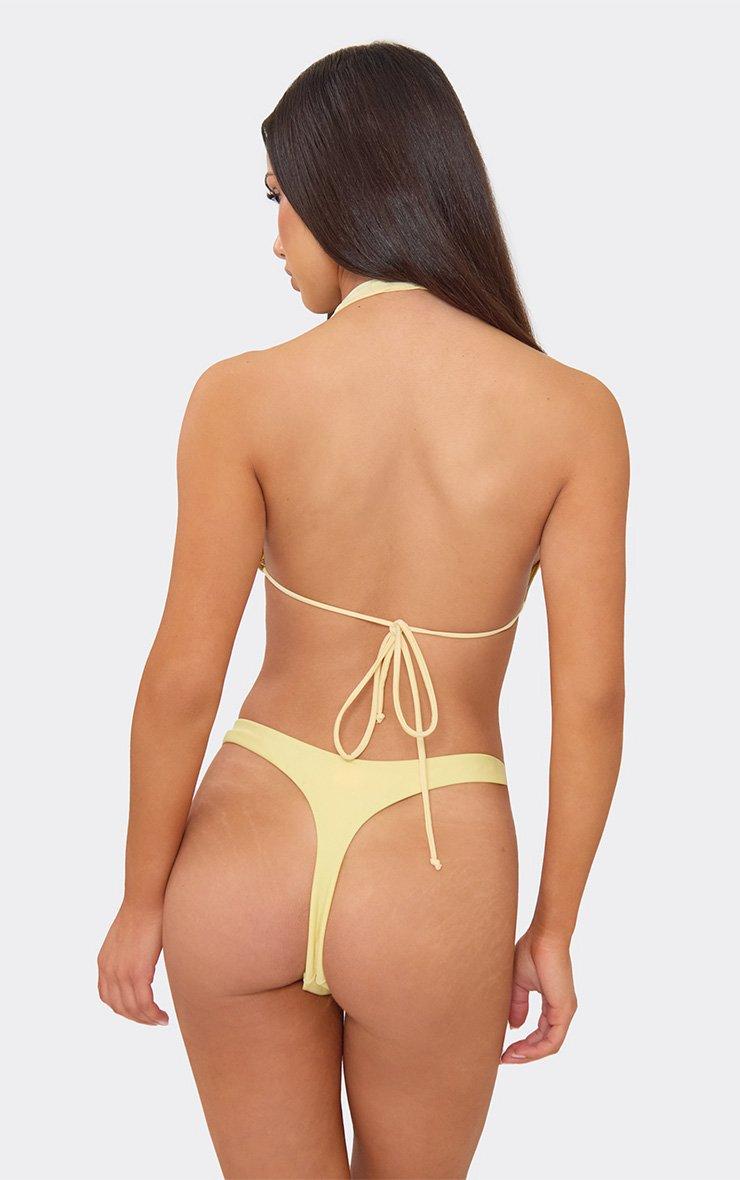 Make a splash in lemon material featuring a halterneck top and thong fit. This sharp, high-octane bikini set delivers a total "zesty-chic" aesthetic for a major it-girl finish. Style with an oversized white shirt and gold jewelry for a polished vibe.