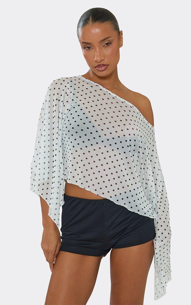 Steal the spotlight at your next summer event. Featuring white polka dot print mesh material with cape detailing and an off the shoulder fit. Team with clear heels and a matching clutch for a look that's totally on-trend.