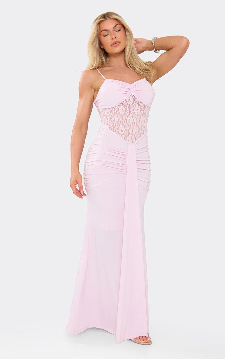 Strappy Twisted Bust Draped Detail Lace Insert Maxi Dress In Pink
