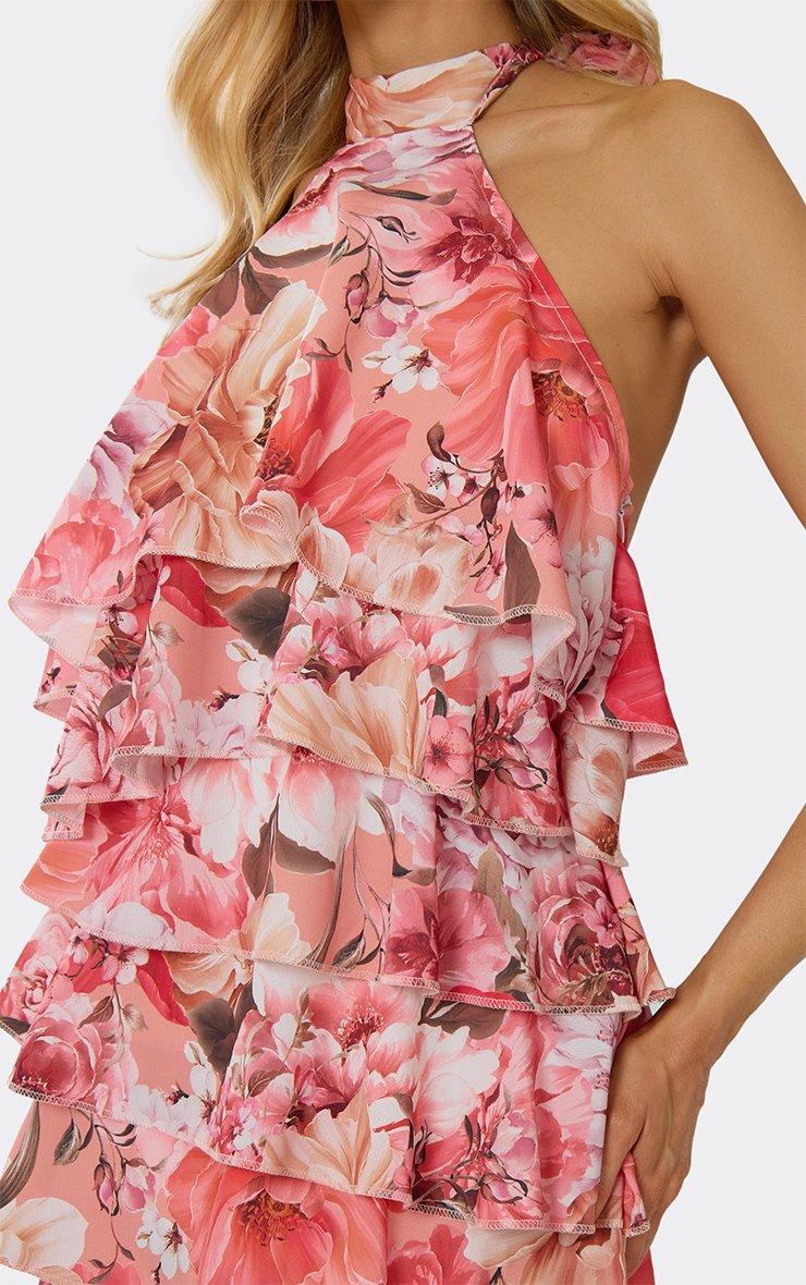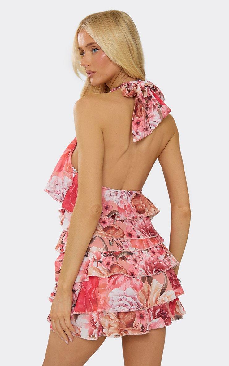 Halterneck Tiered Frill Mini Dress In Multi Floral Print