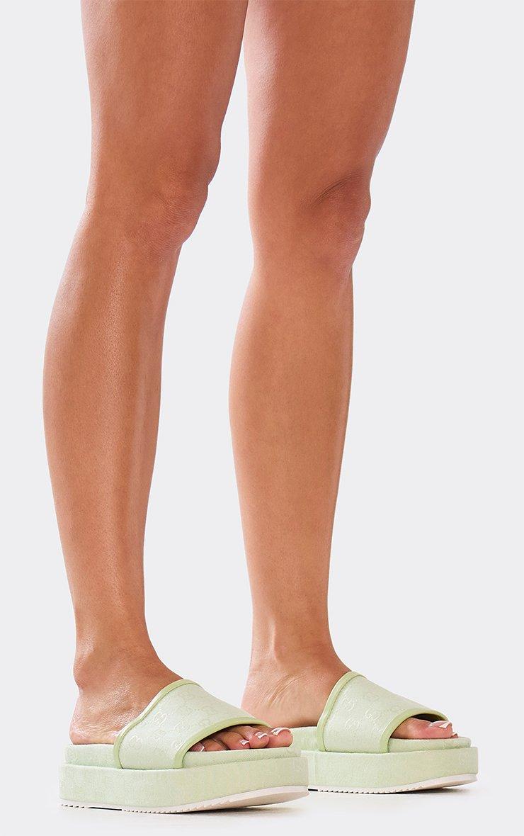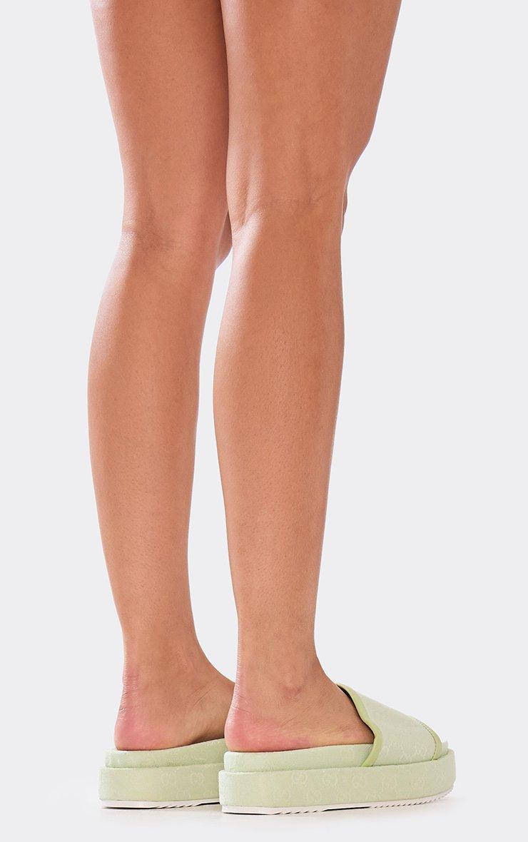 Manic Printed Detail Peep Toe Flatform Slider In Green Fabric
