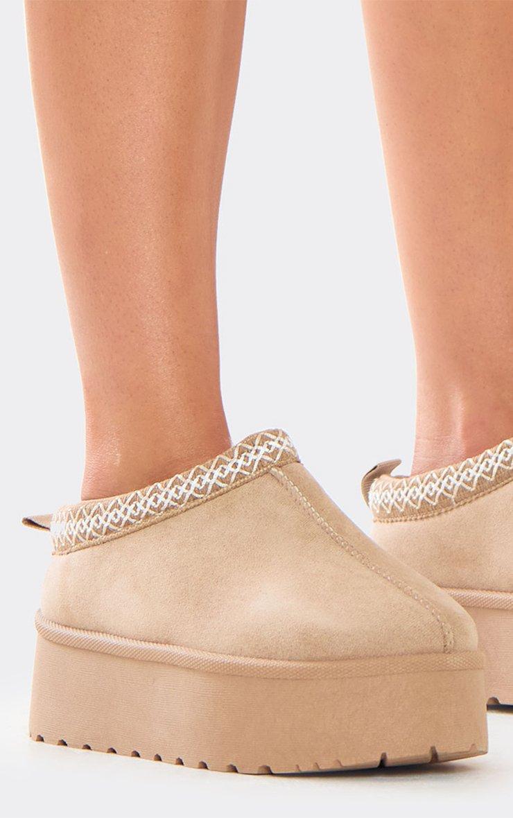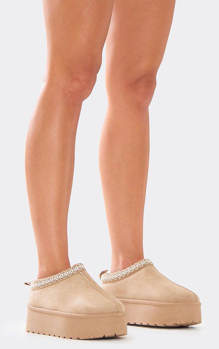Tazmin Aztec Trim Faux Fur Lining Platform Slipper In Taupe Brown Faux Suede