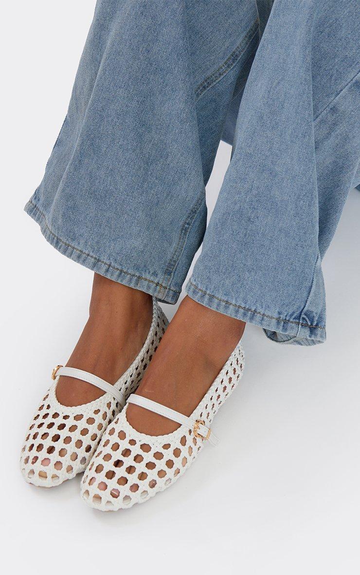 These Almond flats in white are a total vision, featuring a woven texture and buckle strap for a fresh, off-duty aesthetic. Pair them with blue denim and a white tee to complete the look.