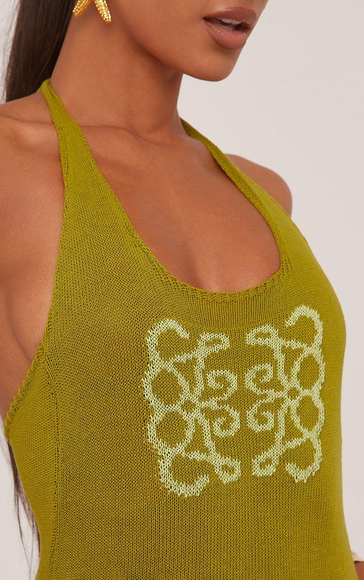 Halterneck Swirl Detail Contrast Tassel Mini Bodycon Dress In Green Knit